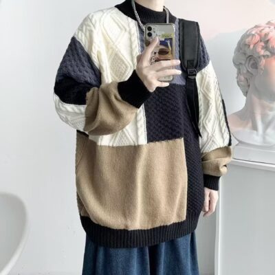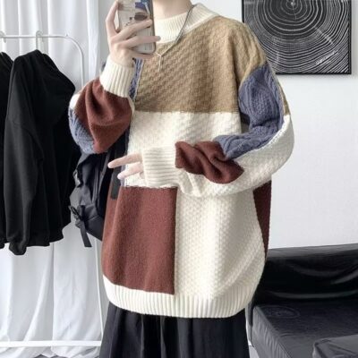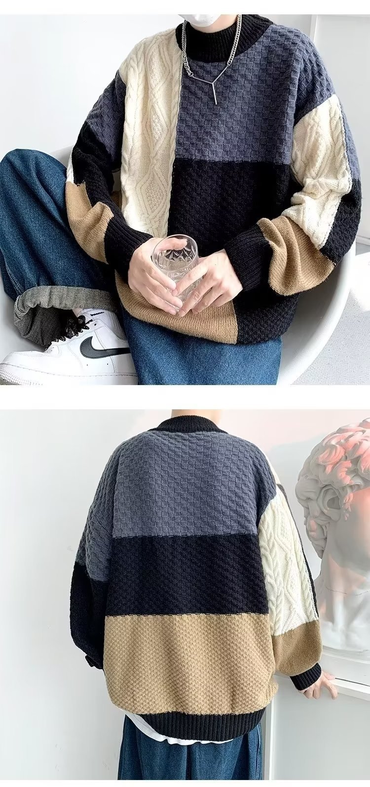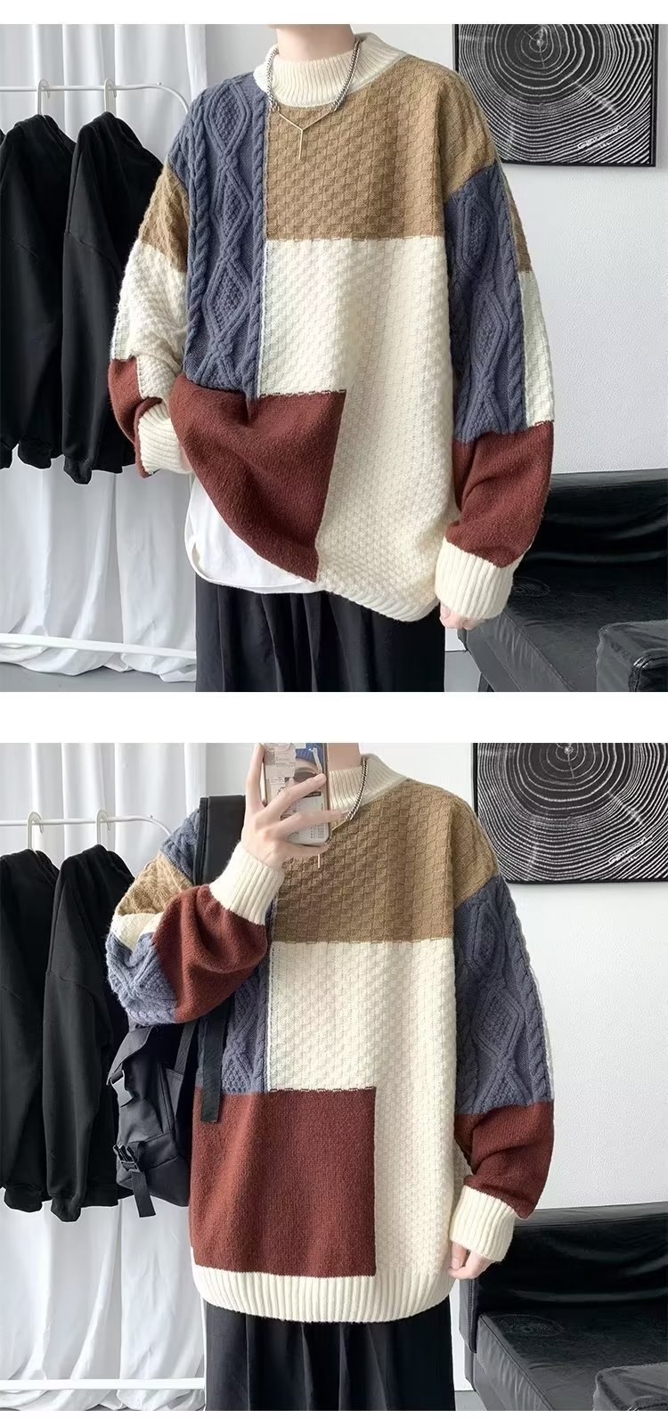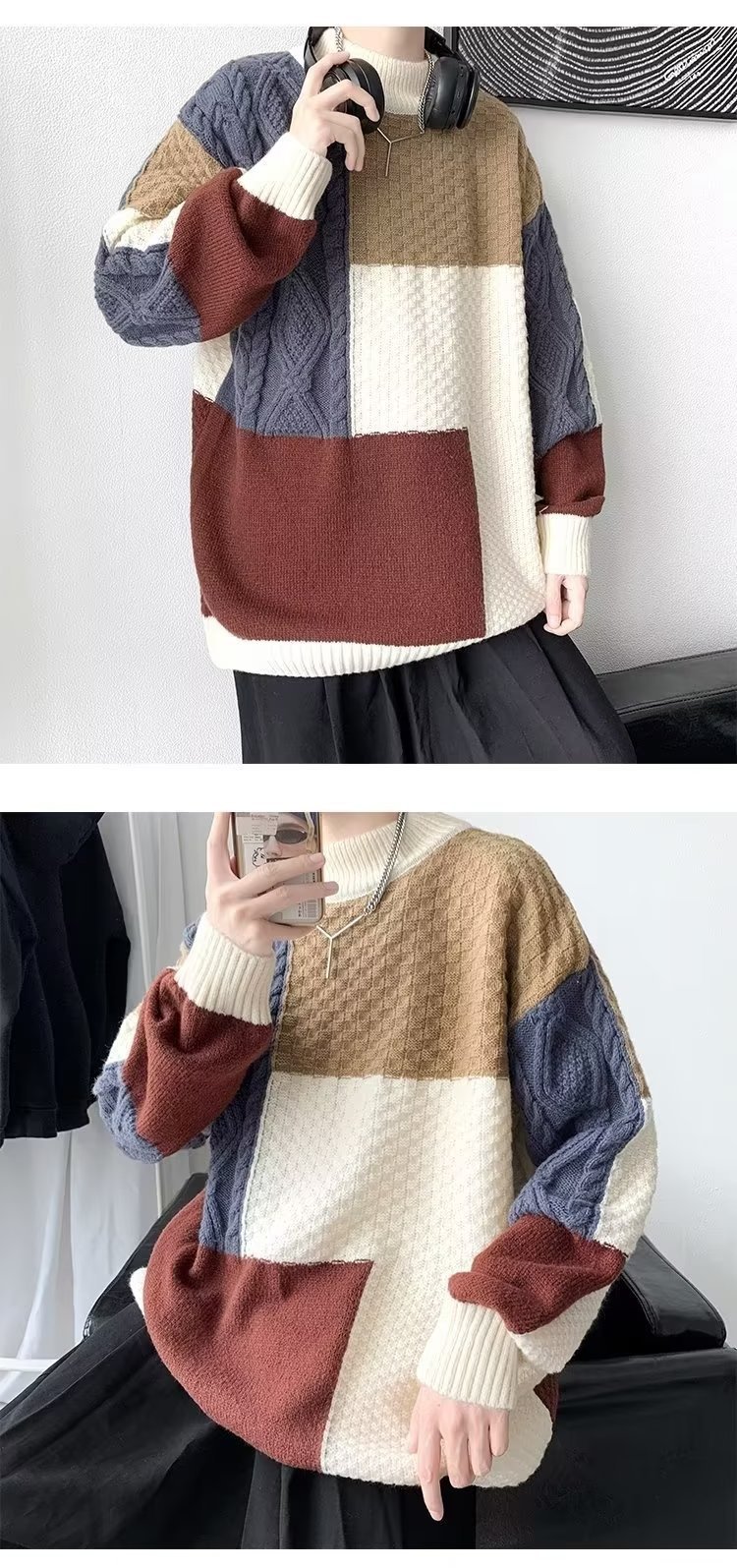Mùa thu phong cách Hồng Kông ins nối màu tương phản áo len dệt kim áo len nam và nữ rời tất cả các trận đấu thủy triều thương hiệu mặc bên ngoài áo len cổ tròn