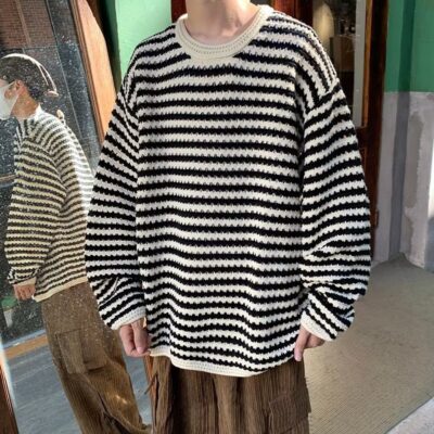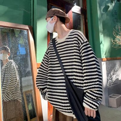 Mùa Thu Retro Sọc Rỗng Áo Len Dệt Kim Dài Tay Bé Trai Thiết Kế Cảm Giác Lười Phong Cách Cổ Đáy Áo Len Hàng Đầu