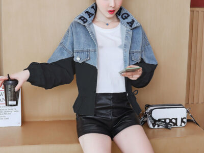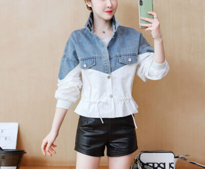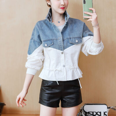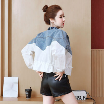 Mùa xuân năm 2023 mới thời trang nữ mùa xuân và mùa thu phổ biến dáng rộng ngắn phối denim nối áo khoác triều
