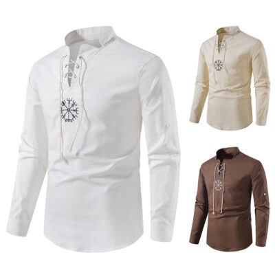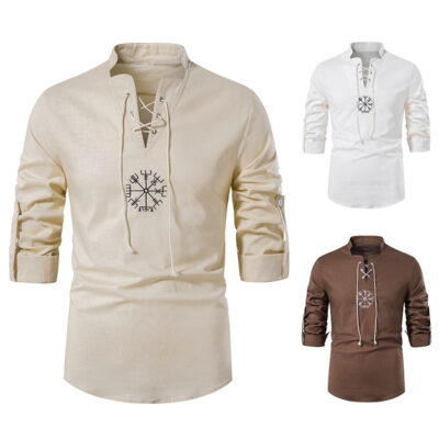 Mùa xuân và mùa thu 2023 áo sơ mi cotton và vải lanh nam thương mại nước ngoài mới Amazon kích thước châu Âu dài tay màu trơn dân tộc yoga hàng đầu nam