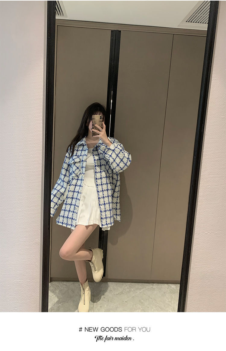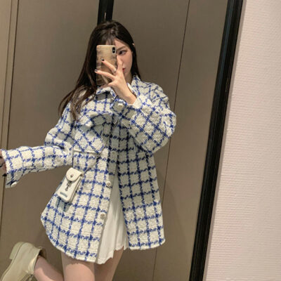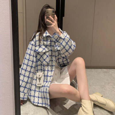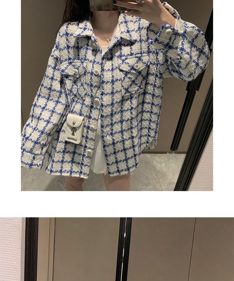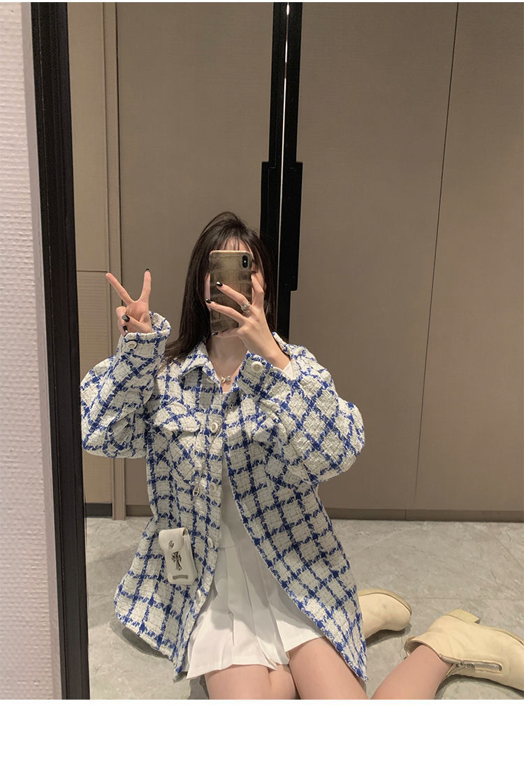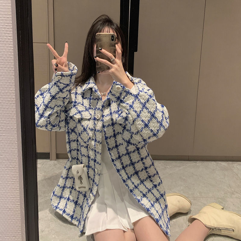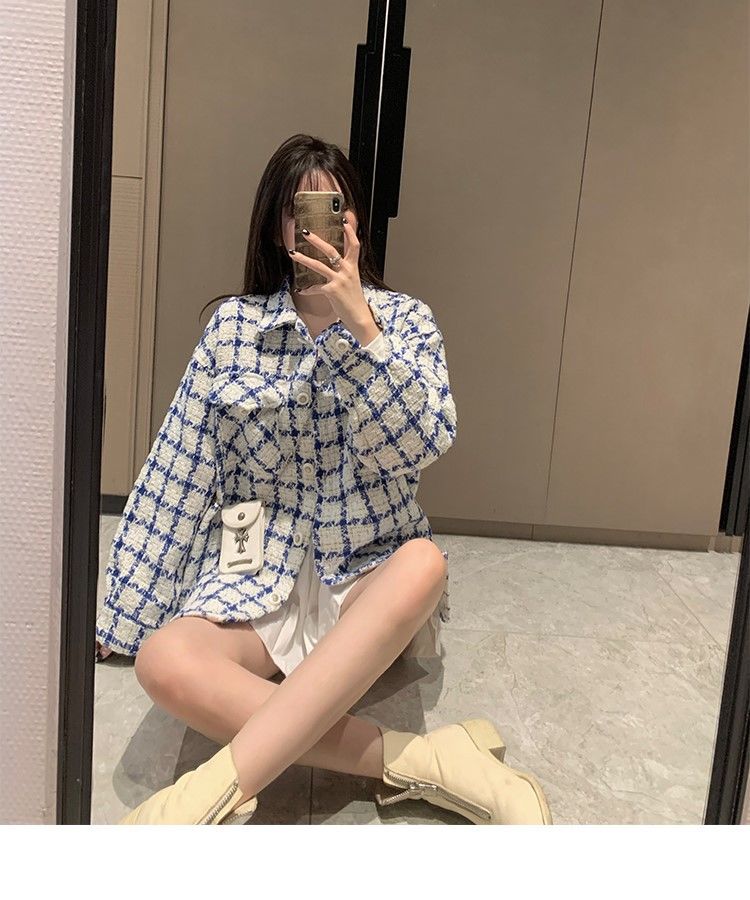 Mùa xuân và mùa thu Kẻ sọc xanh và trắng Rời phong cách đại học Tweed Dệt áo khoác gió nhỏ thơm Áo sơ mi kiểu phương Tây của phụ nữ Áo khoác