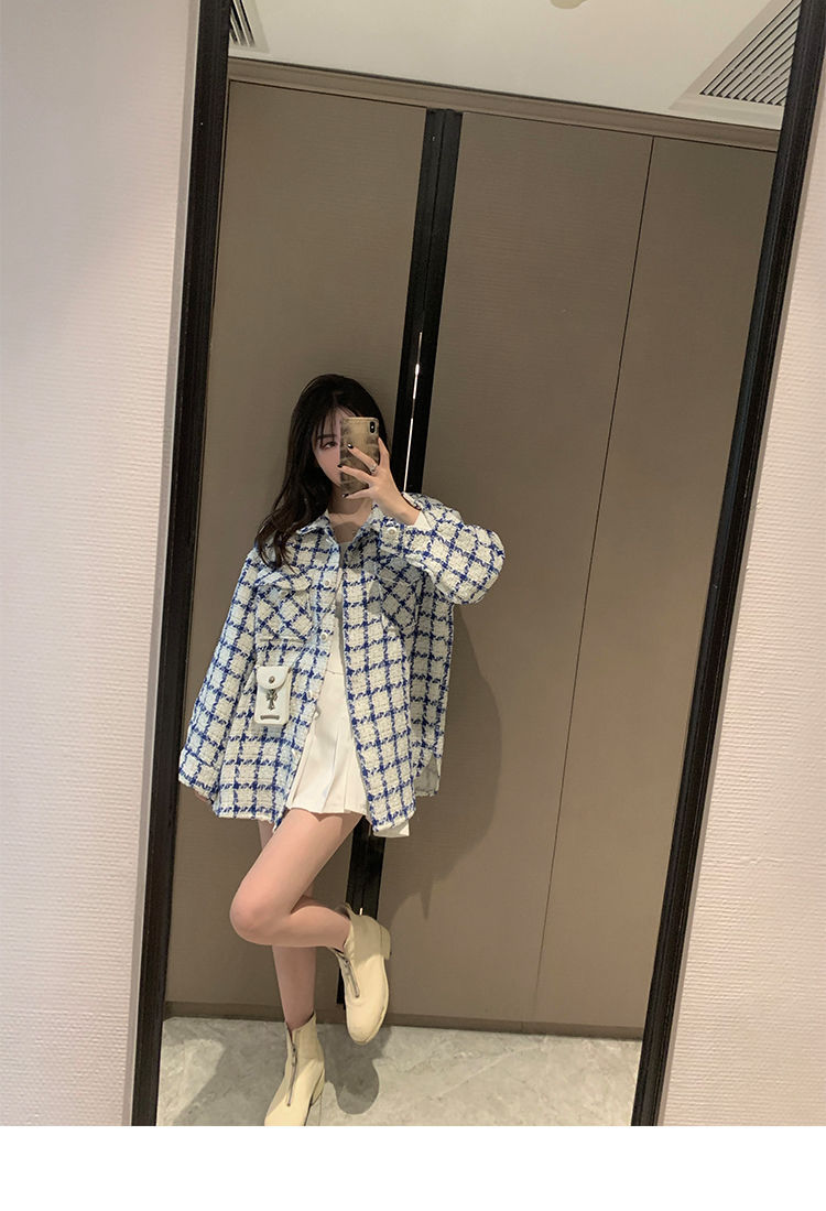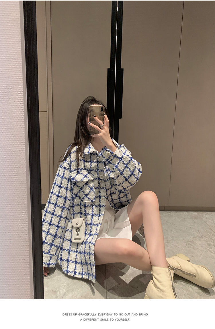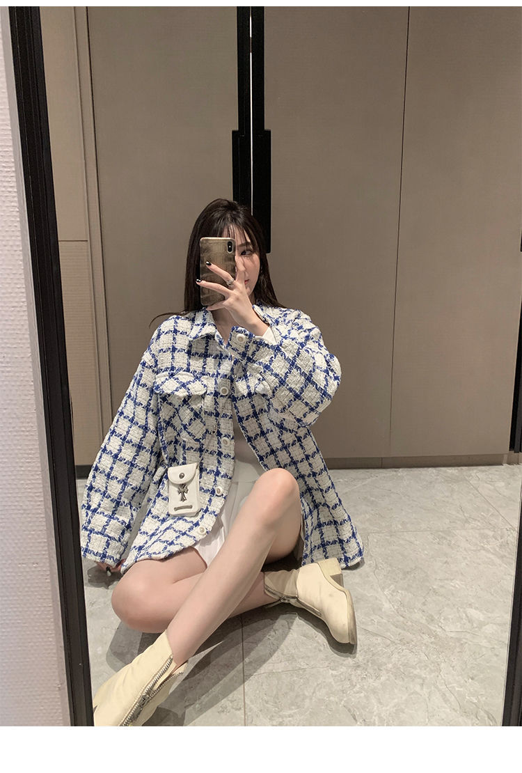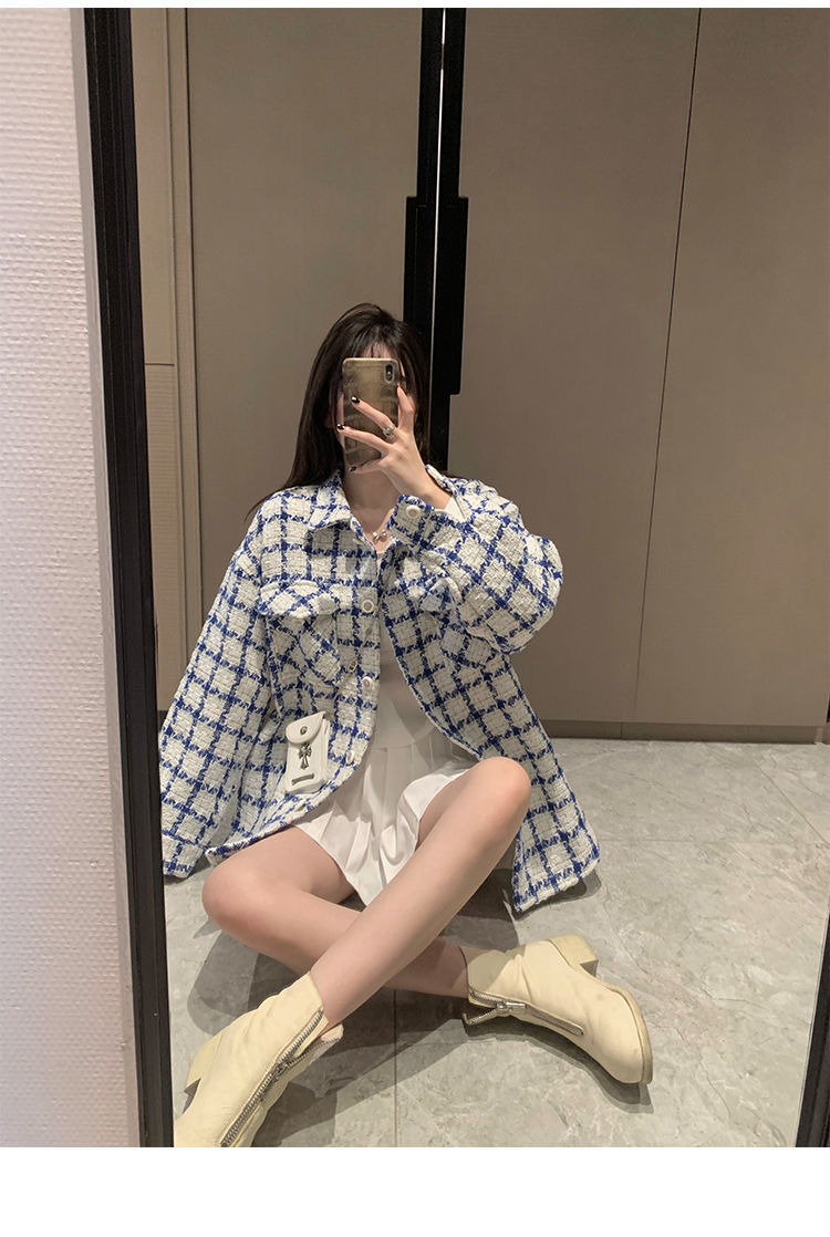 Mùa xuân và mùa thu Kẻ sọc xanh và trắng Rời phong cách đại học Tweed Dệt áo khoác gió nhỏ thơm Áo sơ mi kiểu phương Tây của phụ nữ Áo khoác