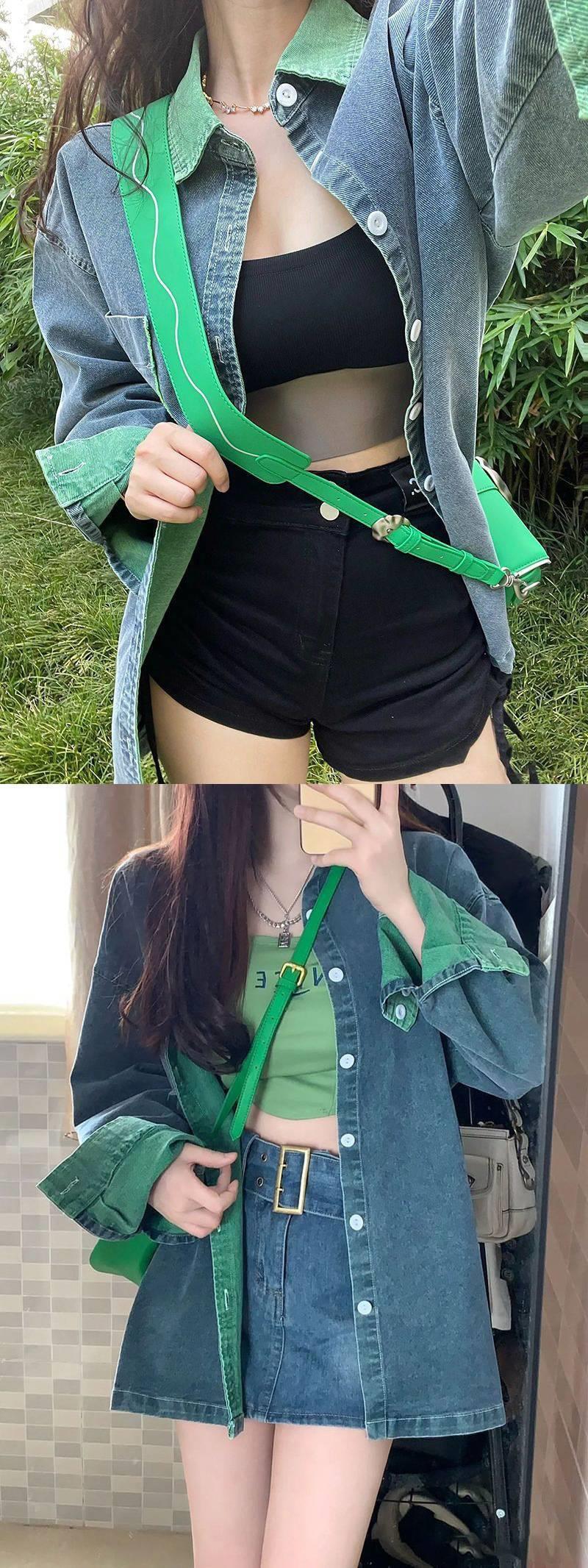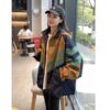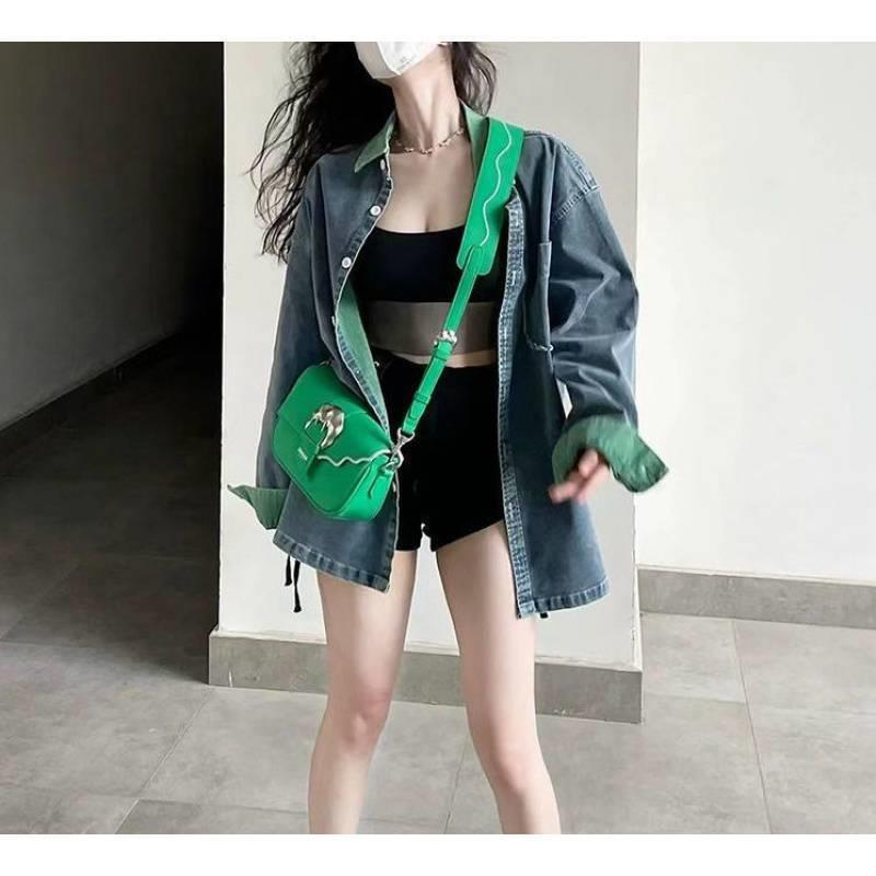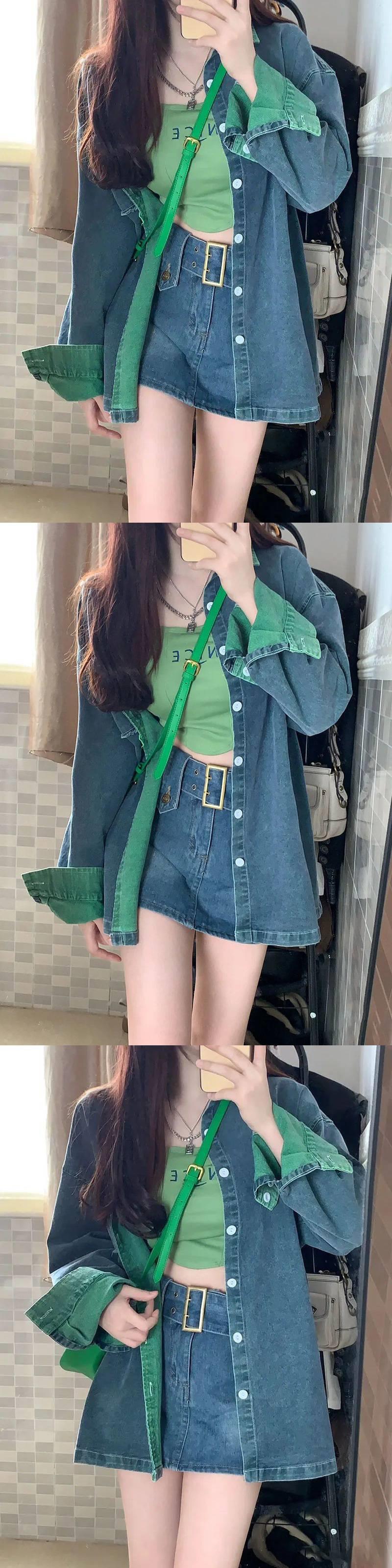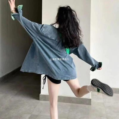 Mùa xuân và mùa thu màu sắc tương phản đường may áo sơ mi denim áo khoác nữ phong cách retro Hồng Kông mới rời áo khoác cặp đôi áo khoác bán buôn