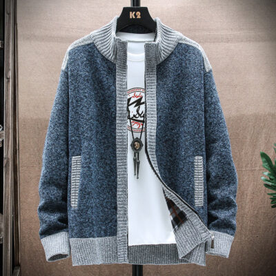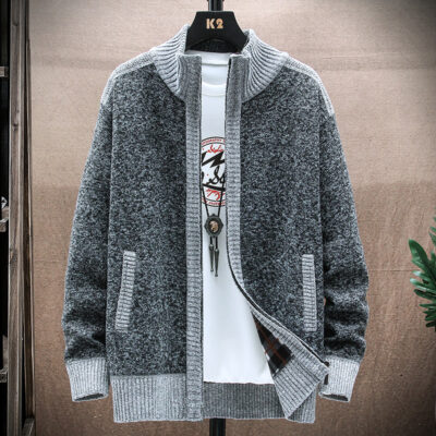 Mùa xuân và mùa thu mới áo len cardigan có khóa kéo nam dáng rộng phiên bản Hàn Quốc phù hợp với mọi đối tượng hợp thời trang áo len nam cổ đứng trung niên và thanh niên