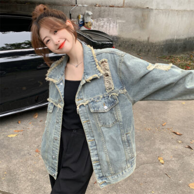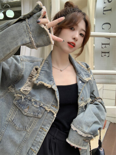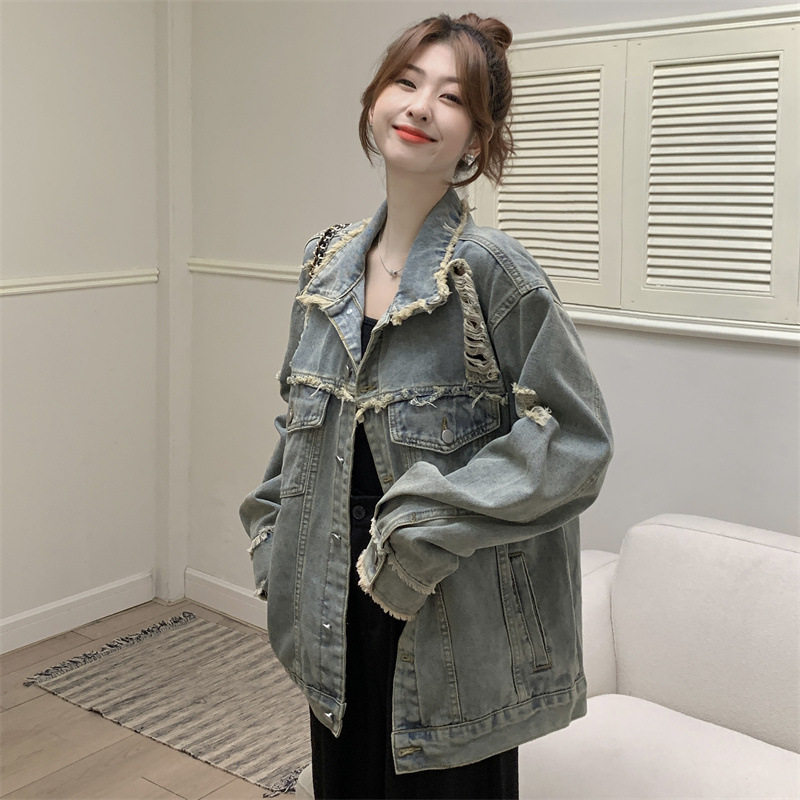 Mùa xuân và mùa thu phiên bản Hàn Quốc mới của phong cách Hồng Kông áo khoác denim dài tay xẻ tà kiểu Mỹ cổ điển cho nữ