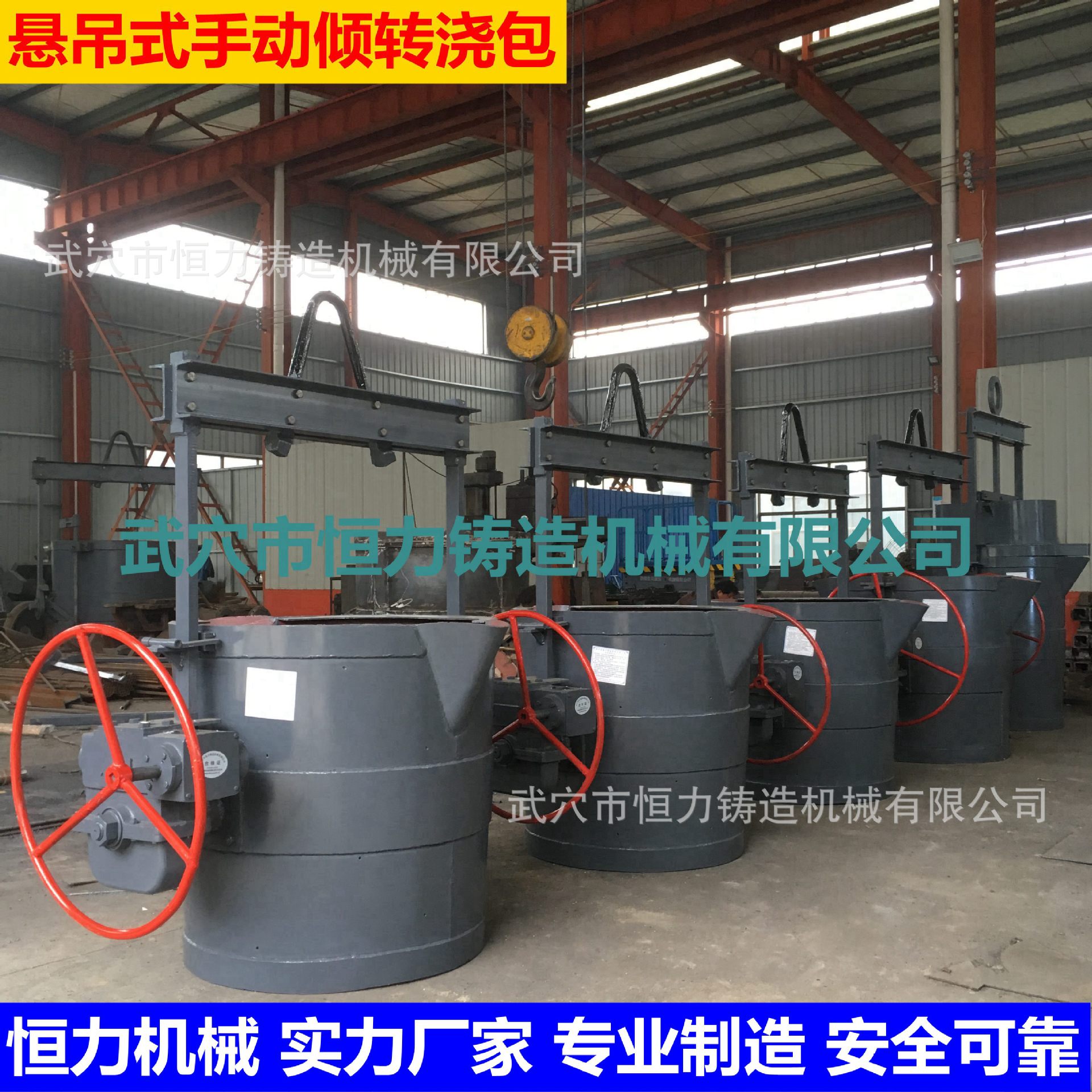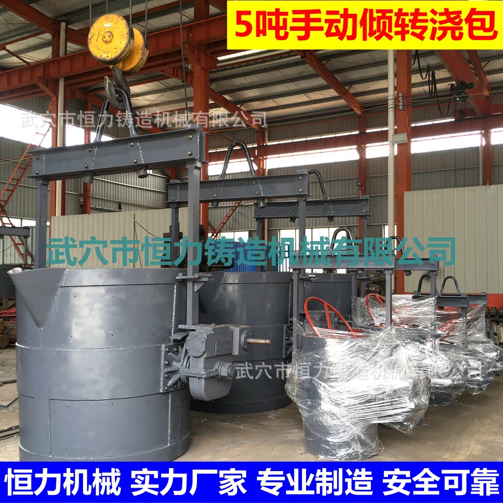 倾转式铁水、钢水浇包:用于承装铁、钢液后,行车悬吊浇注用。减速机采用蜗轮蜗杆传动,转动灵活自如,双向回转,可逆性好。分手动和手电两用,手动操作方便,电动为电机传动安全省力。吊杆采用锻件,比钢板焊接安全可靠;包体钢板较厚,包底采用锥度、底箍、焊筋相结合,既延长了使用寿命,又确保了安全;包体与吊杆和减速箱均装有铰链卡板,可随时锁定;两包轴与吊杆间装有调心轴承,一致性好。