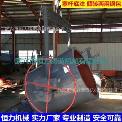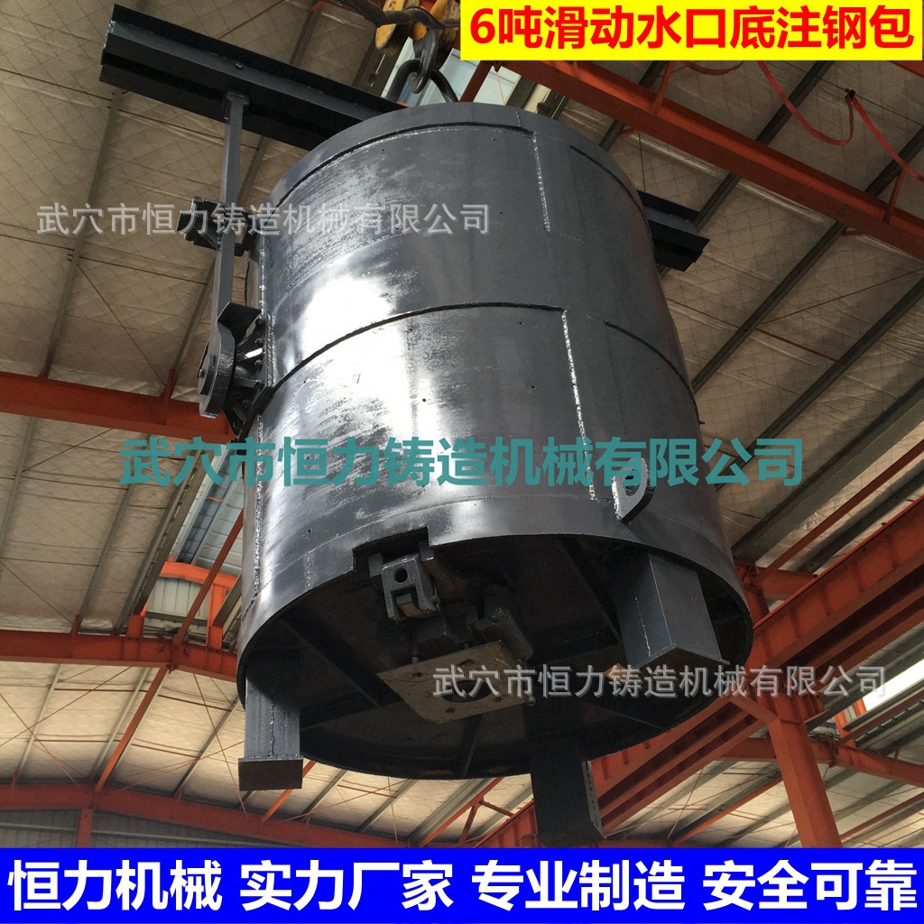 底注式钢水包:结构形式有塞杆底注式、滑动水口底注式;龙门架配有脱勾式与轴承式两种,其中塞杆底注式钢包的升降机构中设有滑杆间隙消除机构,以保证多次使用后,塞杆中心与水口中心的一致。塞杆和滑动水口底注式钢水包为方便倒渣,也可为用户配置手动回转机构(蜗轮蜗杆减速器)。