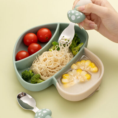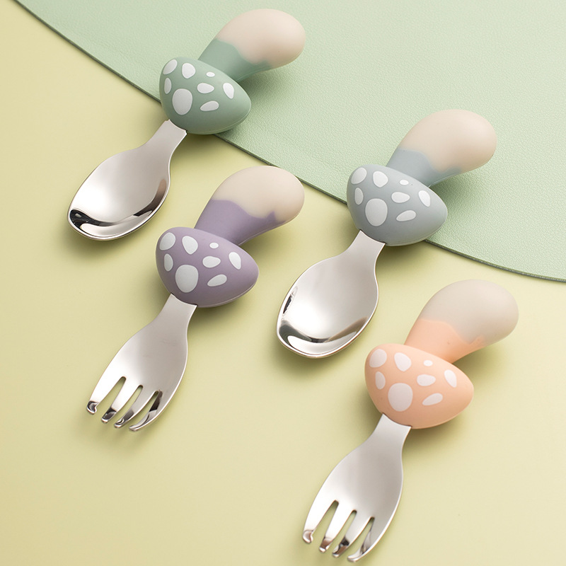 Muỗng Silicone Cho Bé Trẻ Sơ Sinh Thực Phẩm Bổ Sung Bộ Đồ Ăn Sáng Tạo Nấm Trẻ Em Thìa Inox 304 Nĩa Bộ Hộp Quà Tặng
