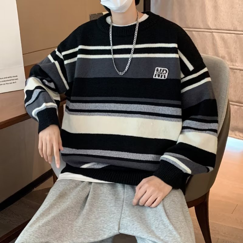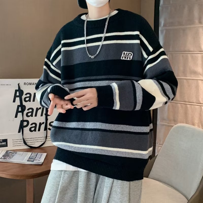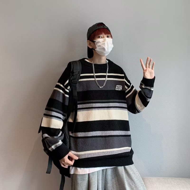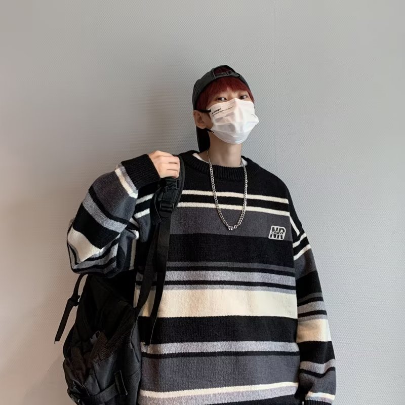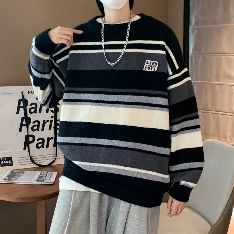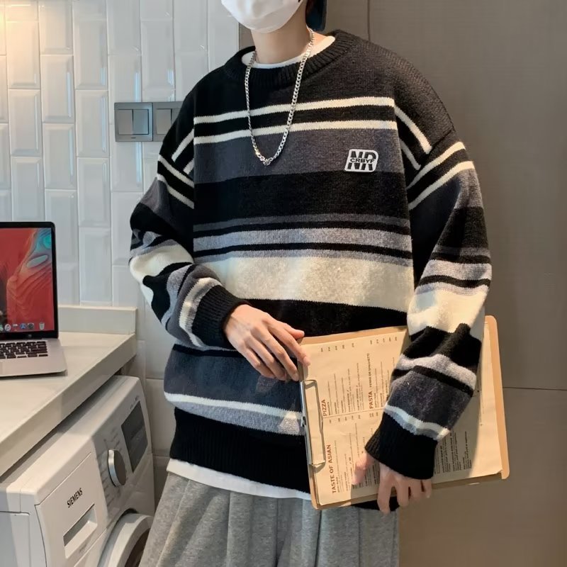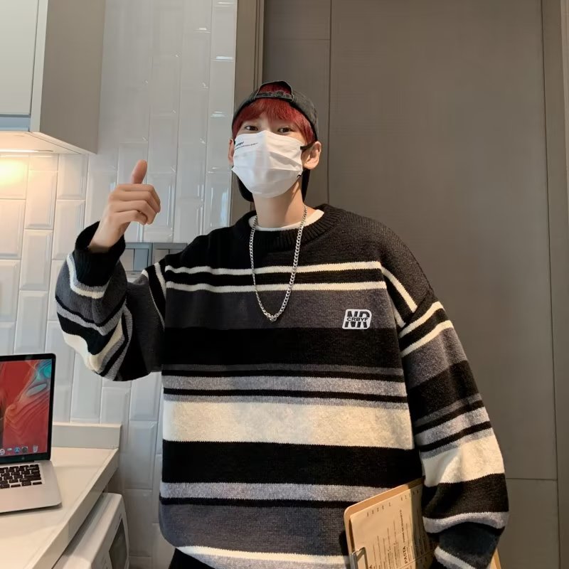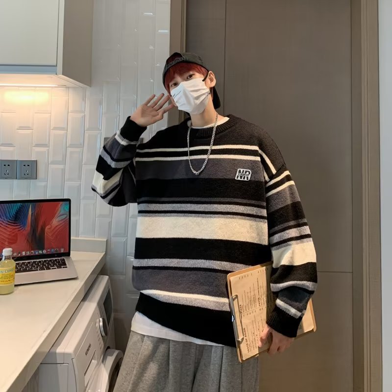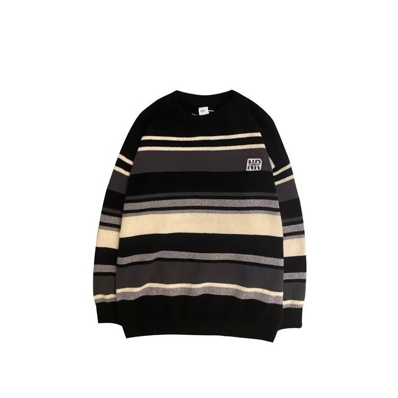 Mỹ áo len nam nữ phong cách retro cơ bản áo len sọc trắng đen áo chui đầu cổ tròn rời áo len dày dặn