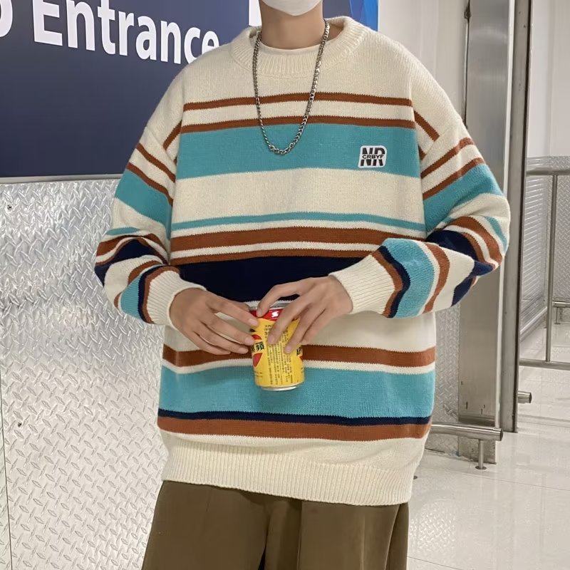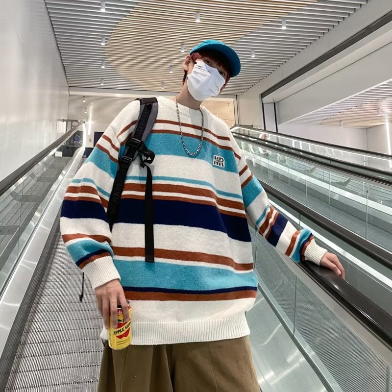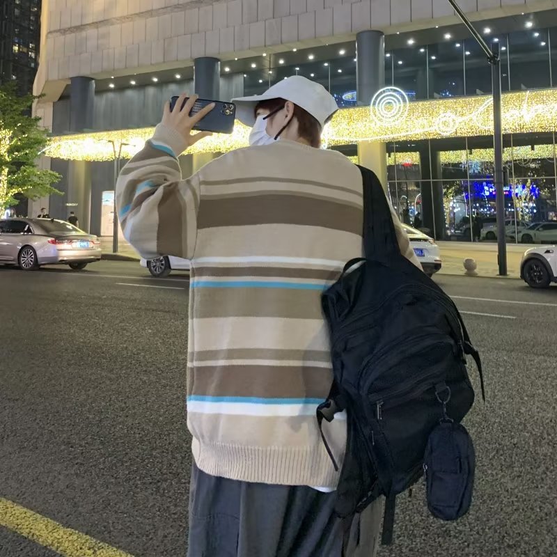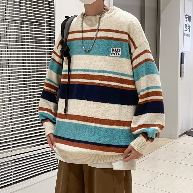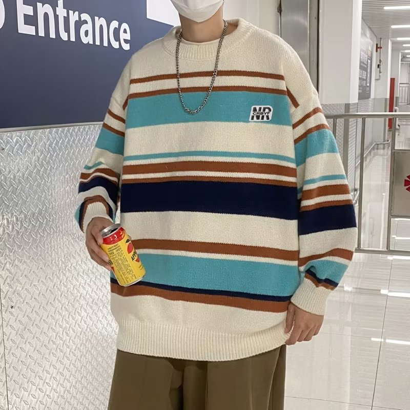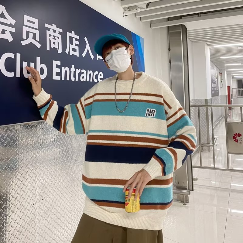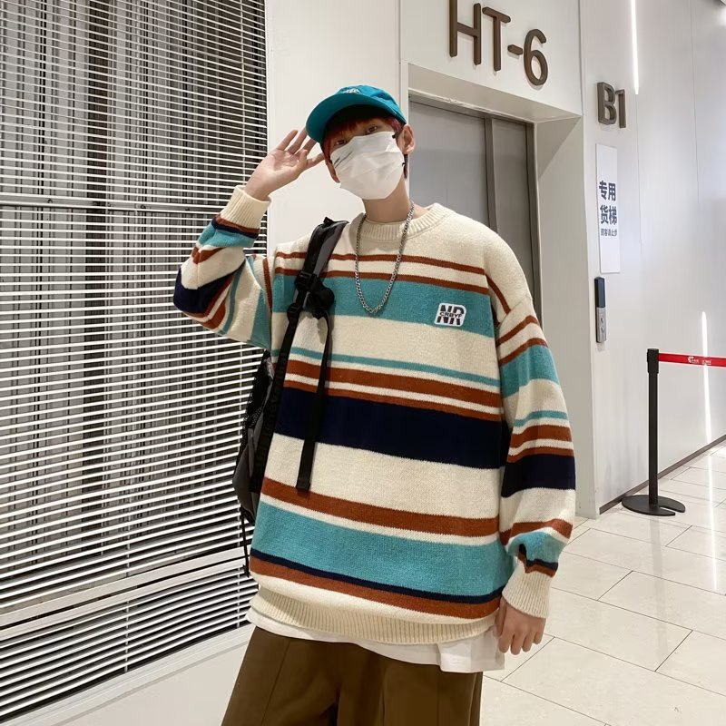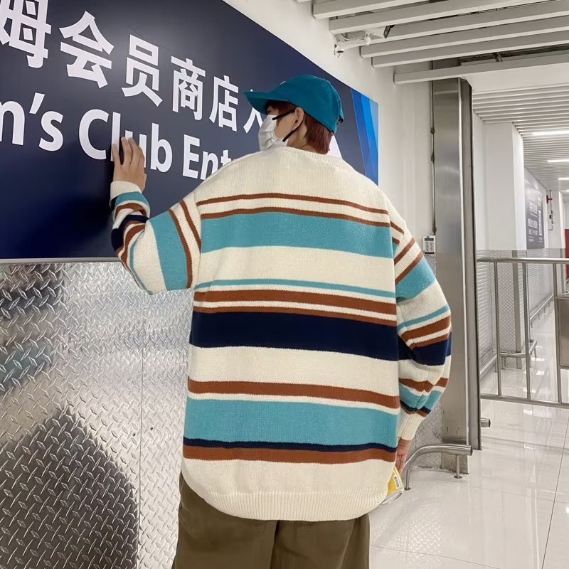 Mỹ áo len nam nữ phong cách retro cơ bản áo len sọc trắng đen áo chui đầu cổ tròn rời áo len dày dặn