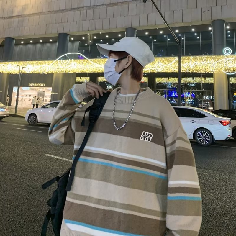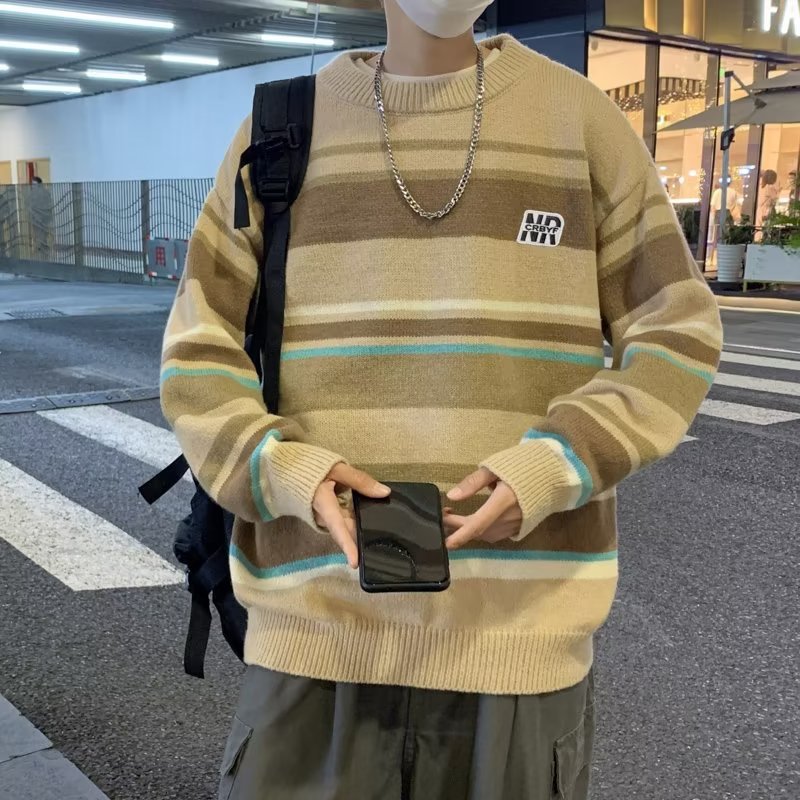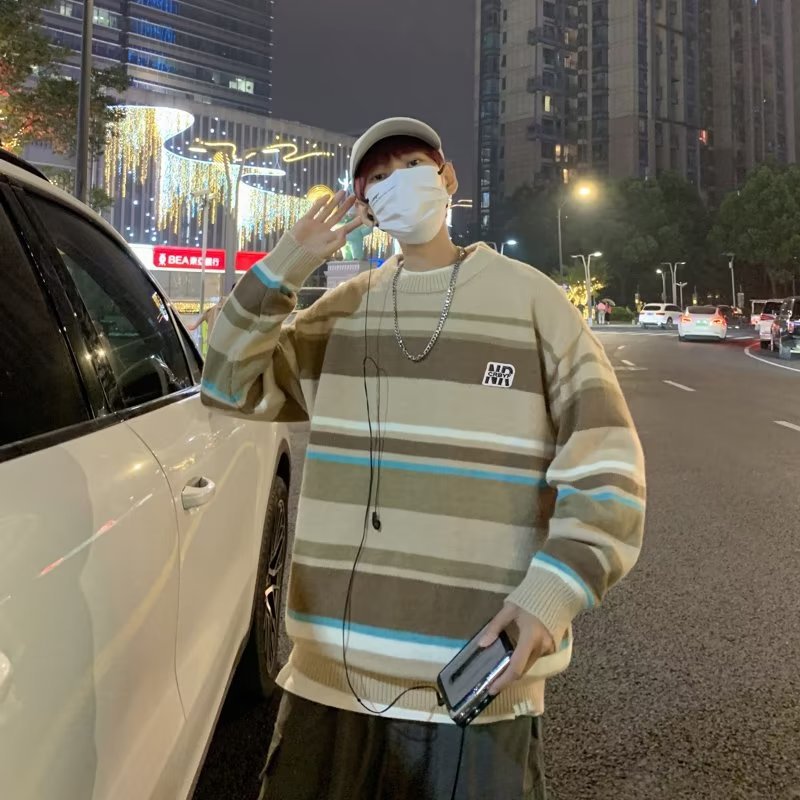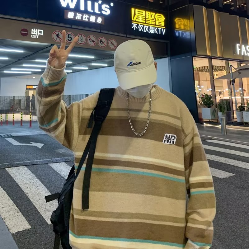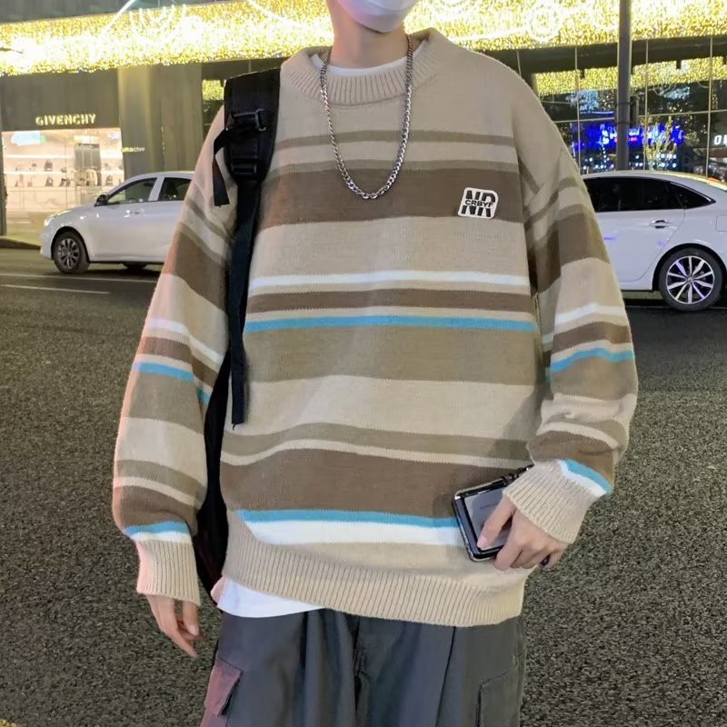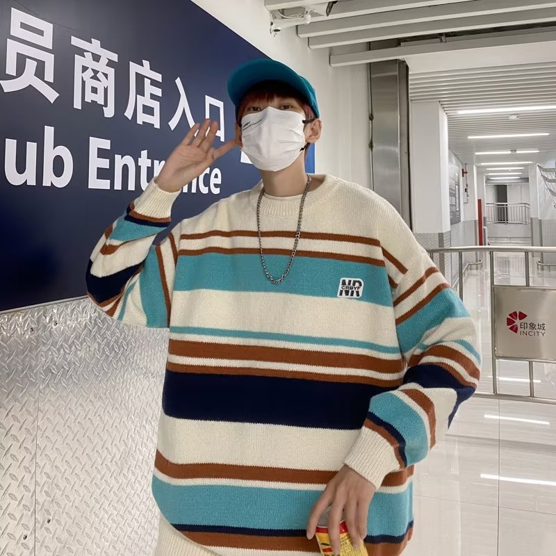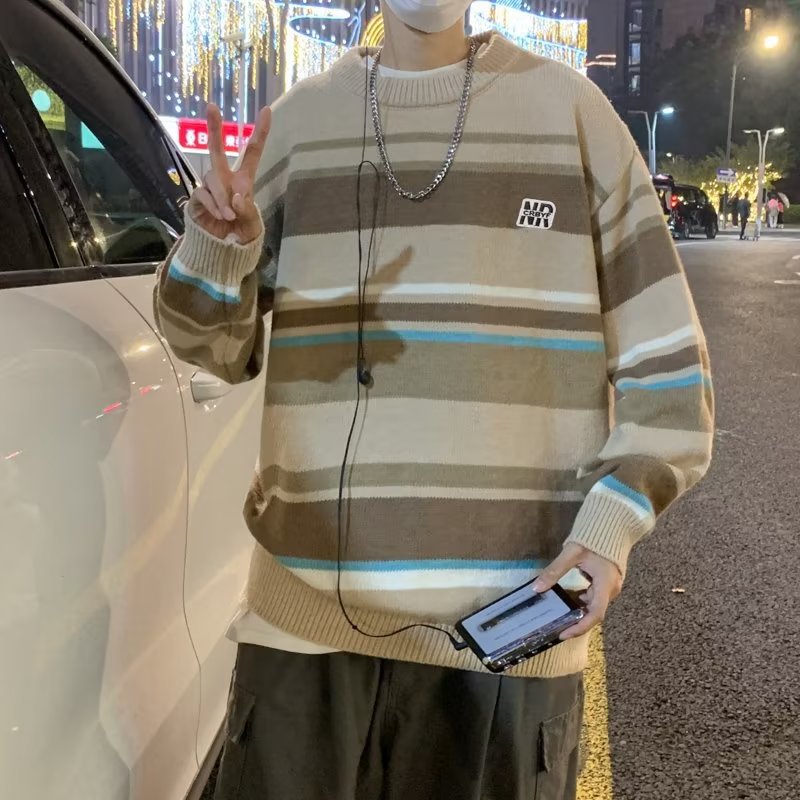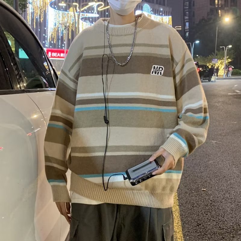 Mỹ áo len nam nữ phong cách retro cơ bản áo len sọc trắng đen áo chui đầu cổ tròn rời áo len dày dặn