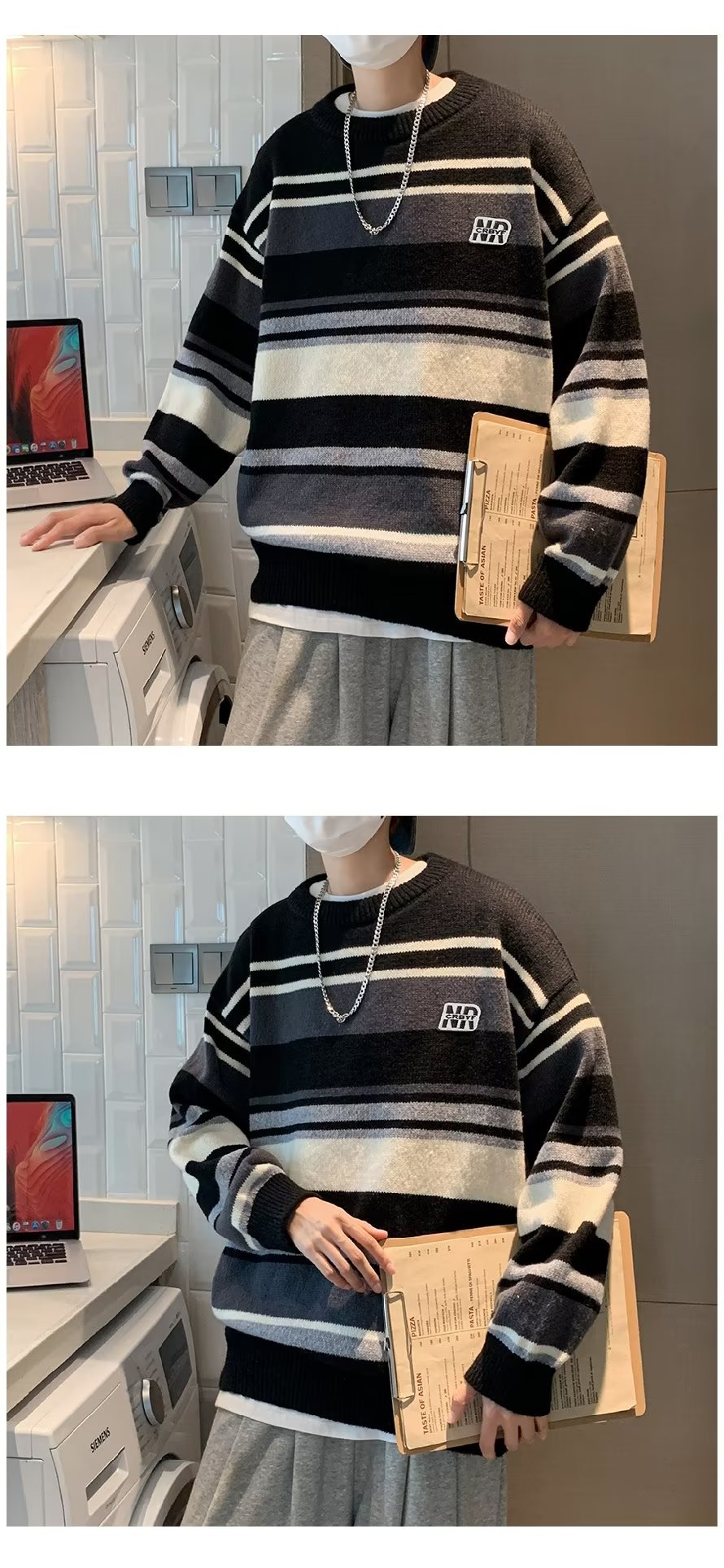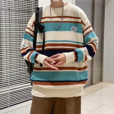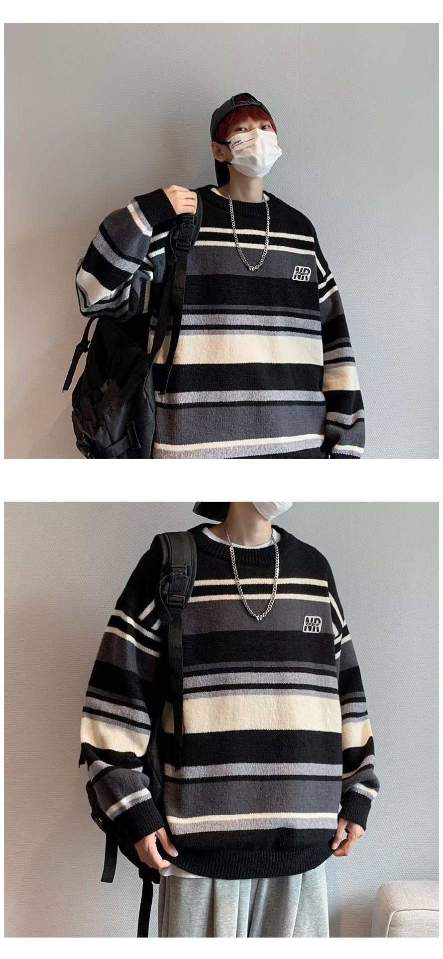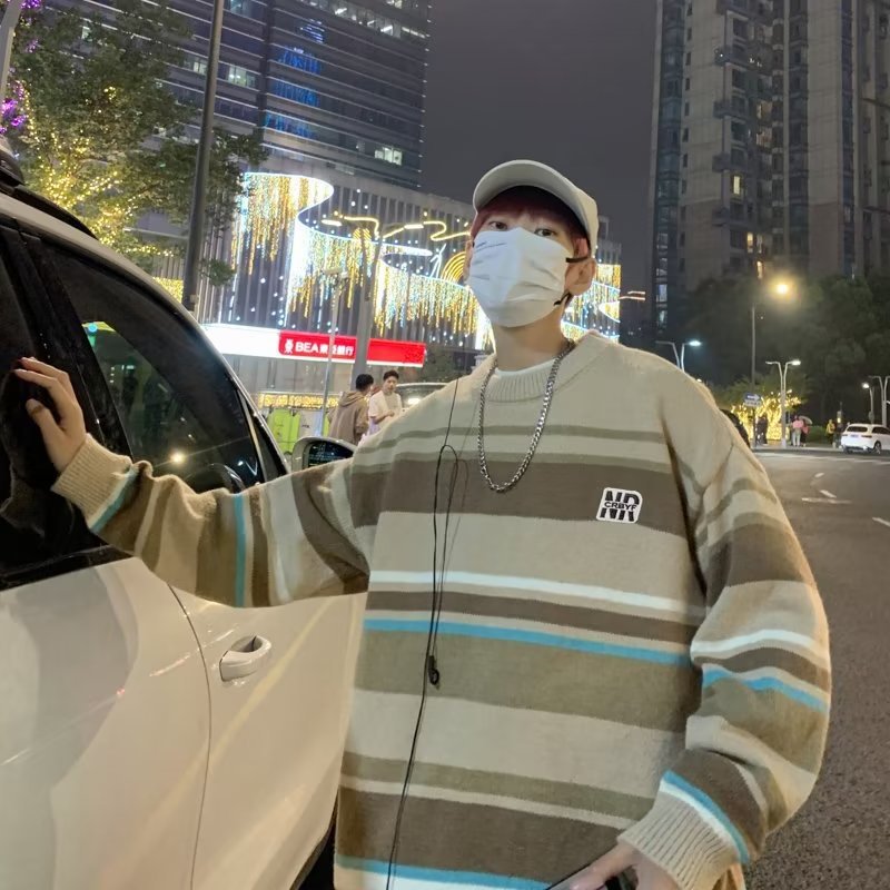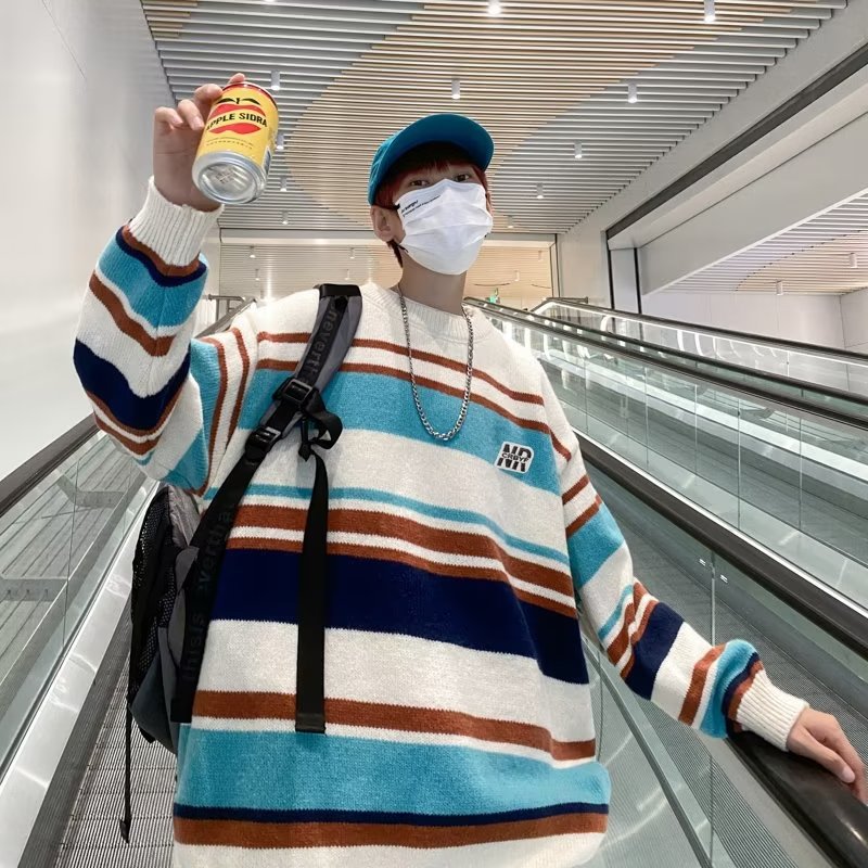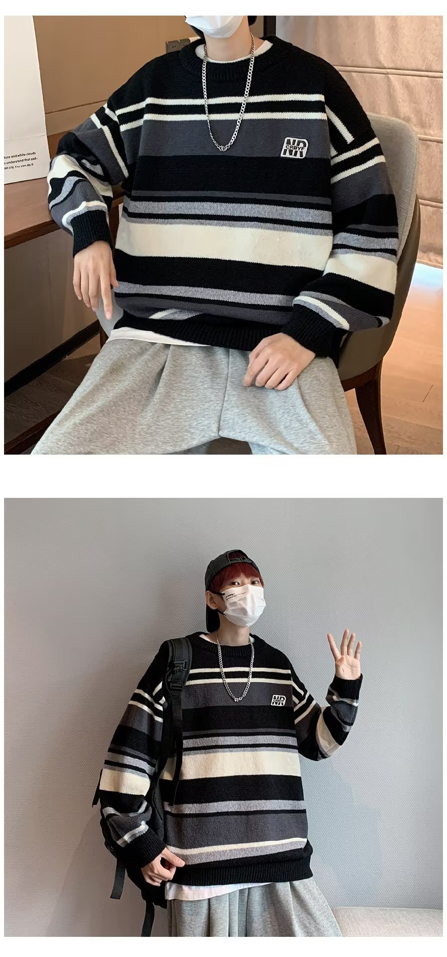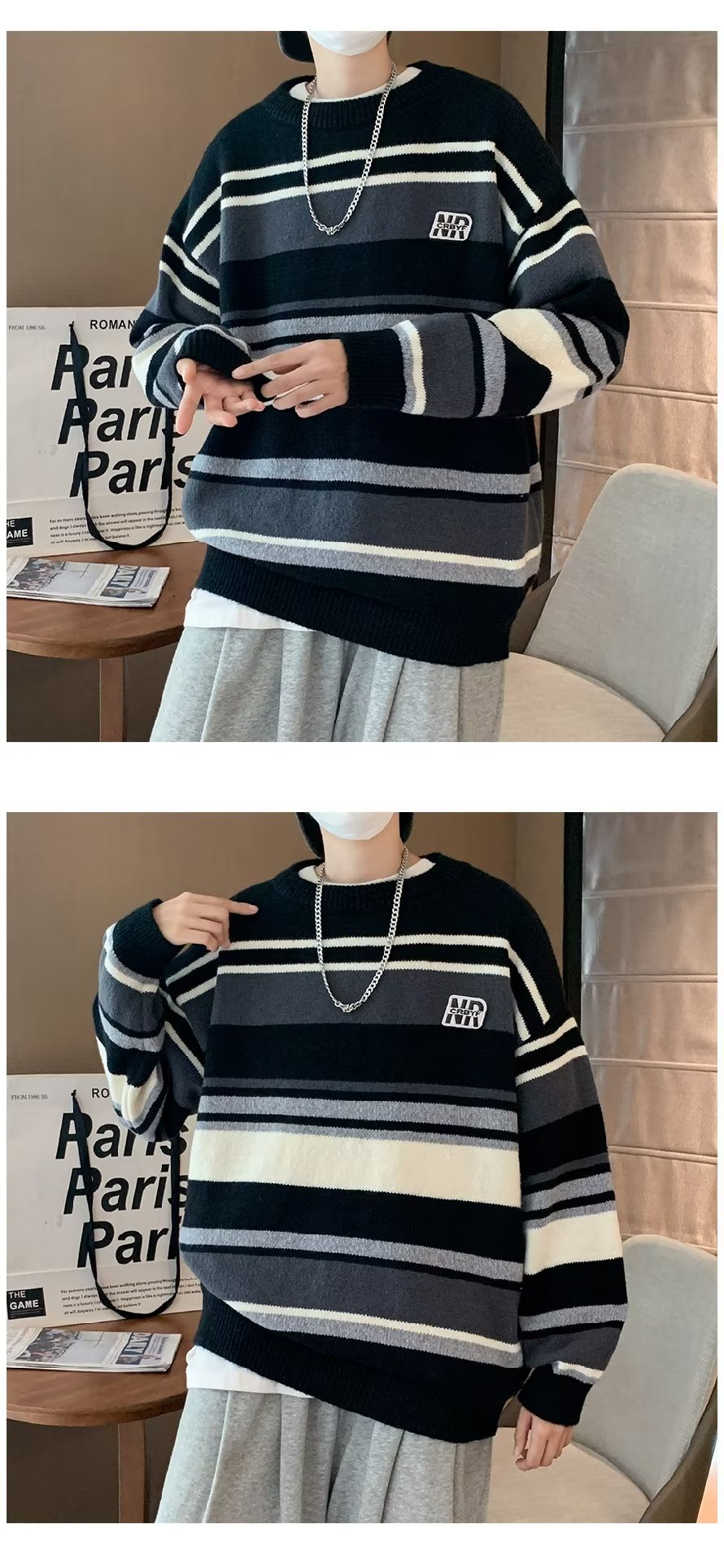 Mỹ áo len nam nữ phong cách retro cơ bản áo len sọc trắng đen áo chui đầu cổ tròn rời áo len dày dặn