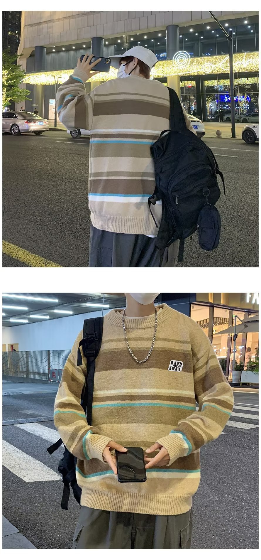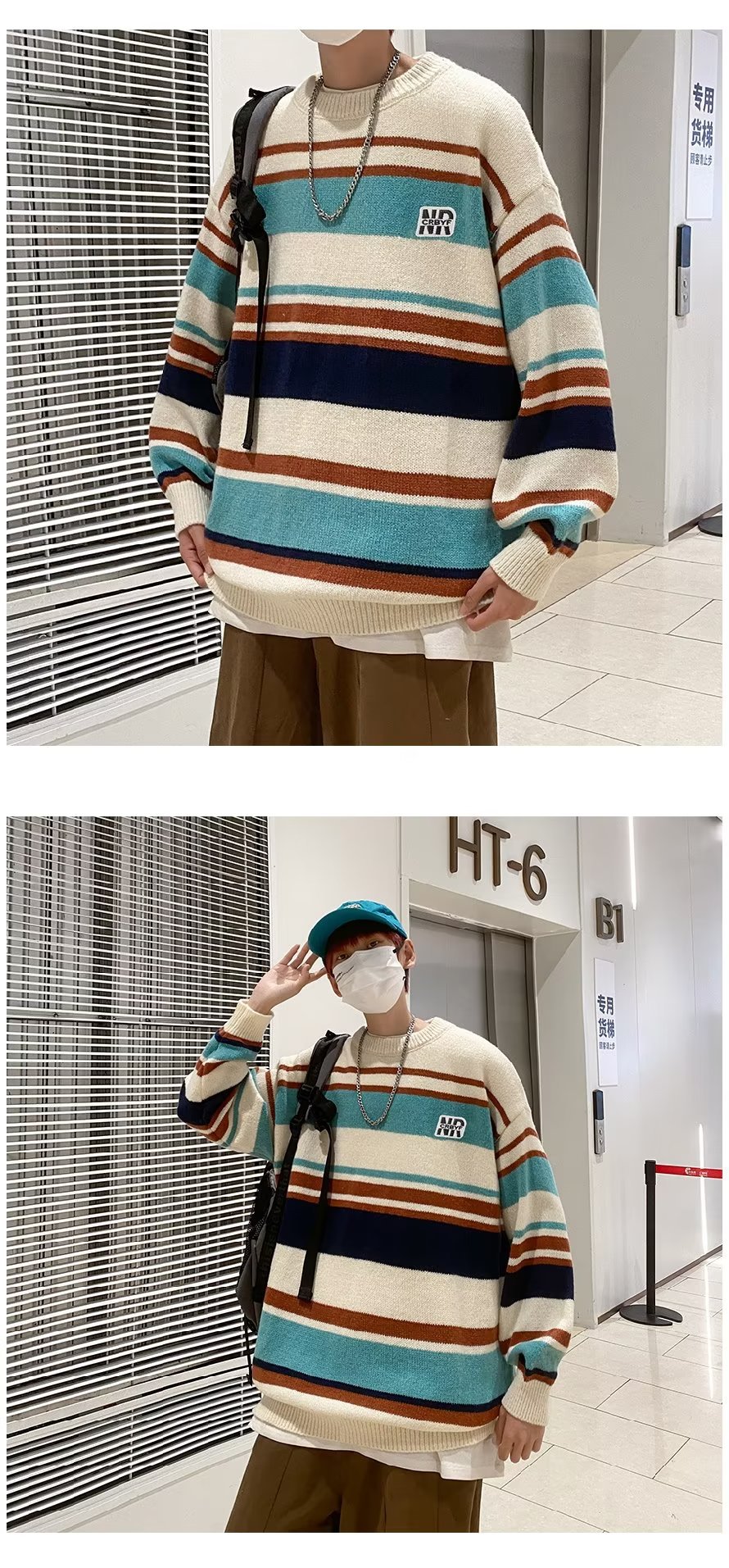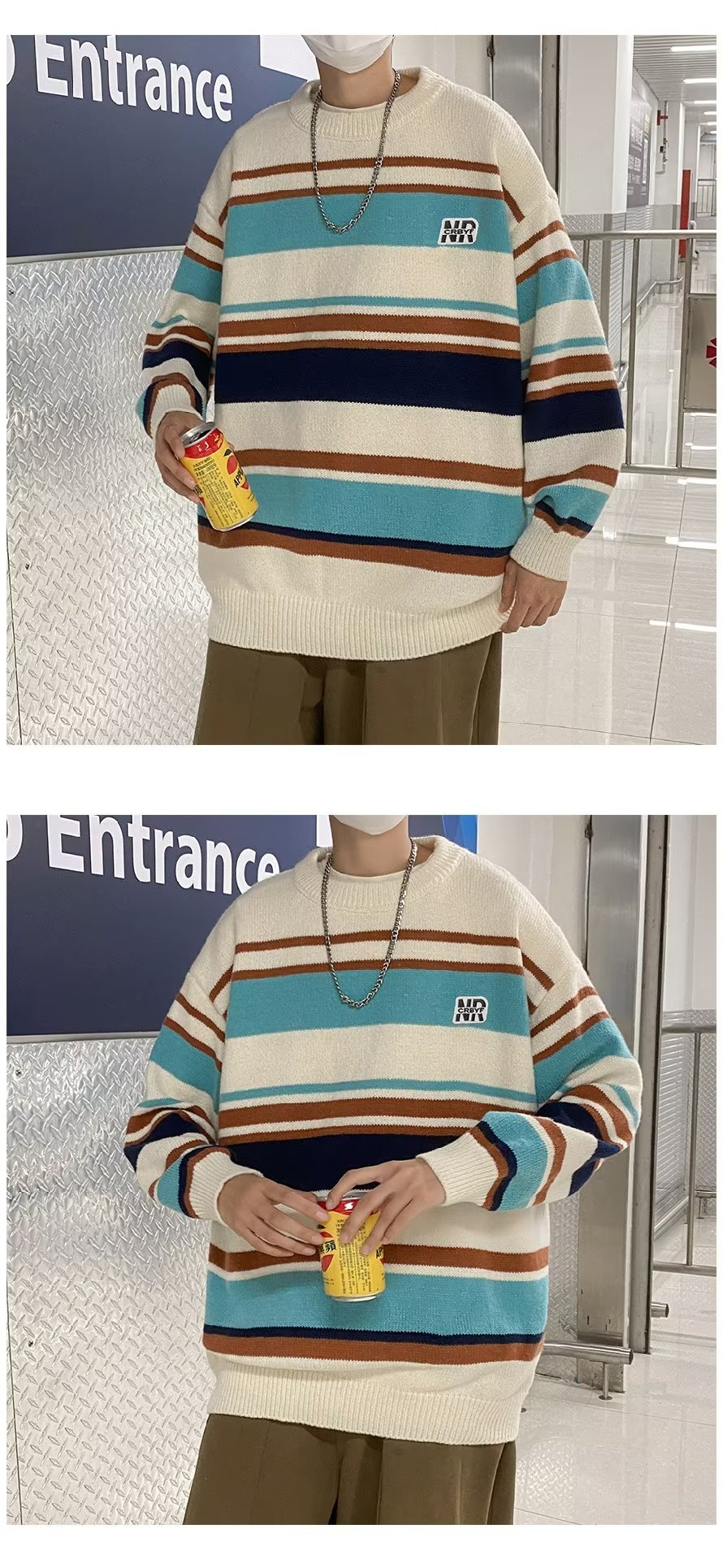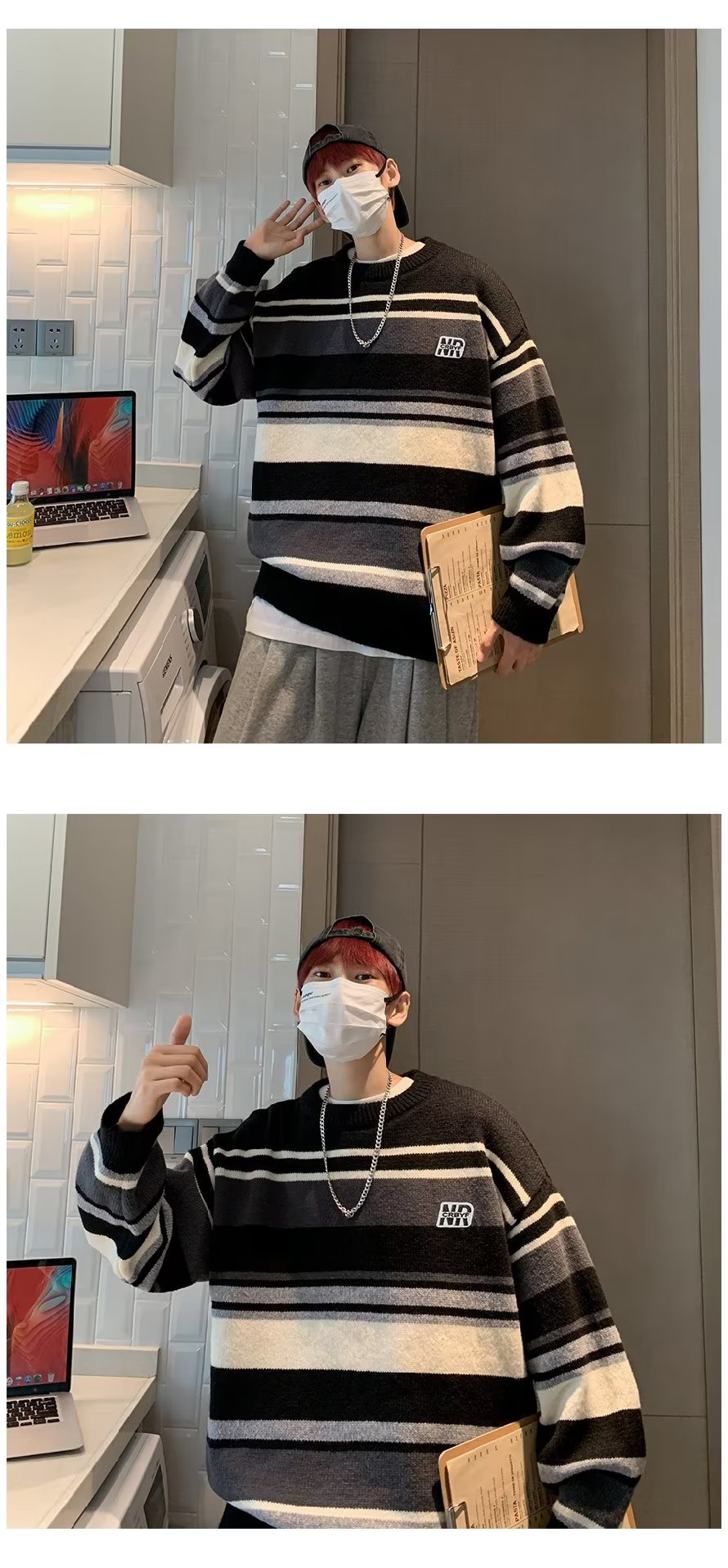 Mỹ áo len nam nữ phong cách retro cơ bản áo len sọc trắng đen áo chui đầu cổ tròn rời áo len dày dặn