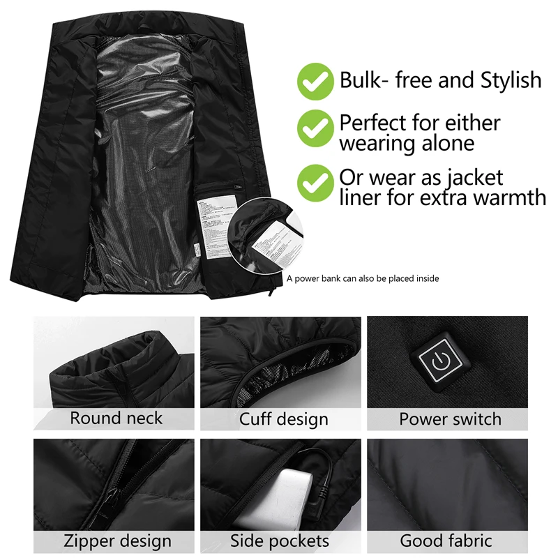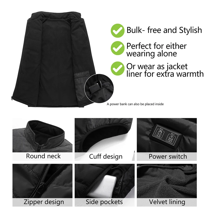 Nam USB Hồng Ngoại 9/15 Khu Vực Sưởi Ấm Áo Khoác Vest Nữ Mùa Đông Điện Làm Nóng Áo Vest Dành Cho Thể Thao Đi Bộ Đường Dài Cơ Thể Giữ Ấm Áo KhoácMùa áp dụng:Mùa thu và mùa đông Cảnh áp dụng:Bình thường Nơi xuất xứ:Trung Quốc (Đại lục) Trang trí:Khóa kéo Số mô hình: 9 khu vực Áo vest sưởi ấm Nam nữ Áo vest sưởi ấm bằng điện Loại khóa: dây kéo Loại: Thông thường Phần có thể tháo rời: KHÔNG CÓ Loại hoa văn: Loại khóa kín :dây kéo Chiều dài quần áo:Thông thường Chất liệu lót:Polyester Mũ trùm đầu:Không Cổ áo:CỔ MANDARIN Phong cách:Bình thường Chất liệu:Polyester Thương hiệu: Gỗ sồi Xuất xứ:Trung Quốc đại lục Loại sản phẩm:Áo khoác ngoài & Áo khoác Loại áo khoác ngoài:Vest Giới tính: NAM