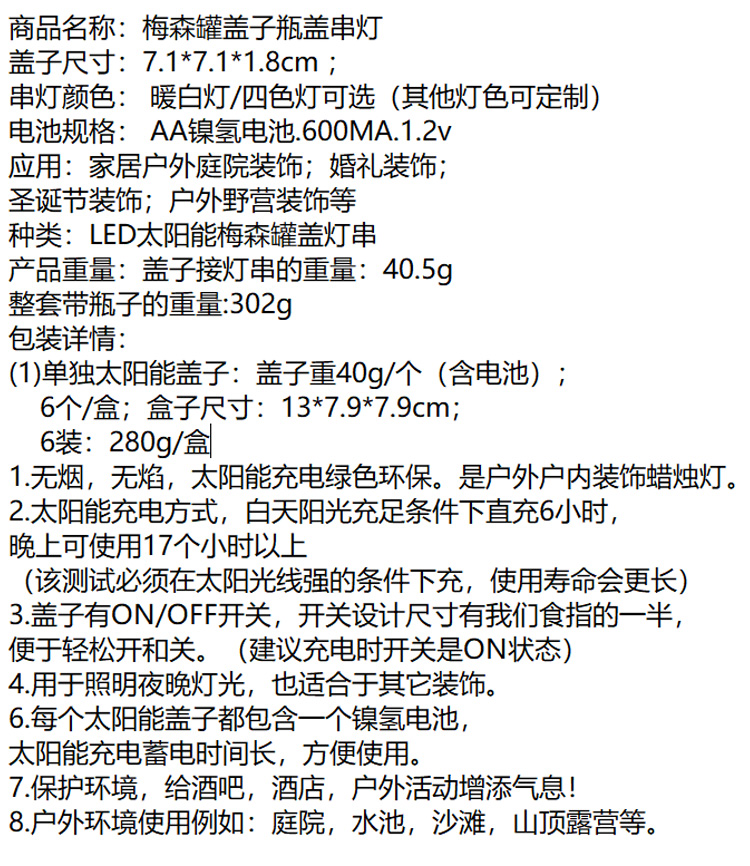 Năng lượng mặt trời Mason Jar treo đèn ngoài trời sân vườn cây treo đèn sân bố trí ban công không thấm nước khí quyển đèn trang trí. Quý khách có nhu cầu mua Đèn ngoài trời nhập khẩu vui lòng liên hệ với chúng tôi để được tư vấn hỗ trợ. Dịch vụ mua hàng Trung Quốc sẽ hỗ trợ quý khách mua hàng từ nhà cung cấp và giao tới tận tay quý khách hàng..Nơi xuất xứ: Trung Quốc đại lục Số sản phẩm: F7567MS85578J8 Thương hiệu: Hạt đèn khác Thương hiệu: Model khác: XM-09875 Công suất định mức: Khác Được cấp bằng sáng chế: Không Chứng nhận: Không Người nộp thuế chung: Không Loại công tắc: Tuổi thọ khác: Loại nguồn sáng khác: Đèn LED ,Mức bảo vệ năng lượng mặt trời: IP65 Điện áp: 36V (đã bao gồm) Kích thước: Khác Xuất khẩu xuyên biên giới có độc quyền để cung cấp hay không: Không Phân loại thông số kỹ thuật: Đèn lọ thủy tinh năng lượng mặt trời 30led ánh sáng nhiều màu sắc 1 gói/Đèn thủy tinh năng lượng mặt trời 30led ánh sáng ấm áp 1 gói/ Đèn hũ mason 30led chạy bằng năng lượng mặt trời ánh sáng ấm áp 1 gói Kiểu dáng: Mỹ đơn giản Thời gian chiếu sáng liên tục: hơn 36 giờ Có nên nhập khẩu không: Không