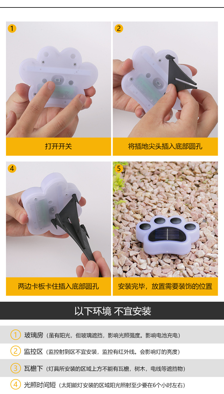Năng lượng mặt trời móng vuốt mèo ngầm đèn ngoài trời không thấm nước ngoài trời sân vườn bố trí biệt thự sân nhỏ trang trí đèn cỏ. Quý khách có nhu cầu mua Đèn ngoài trời nhập khẩu vui lòng liên hệ với chúng tôi để được tư vấn hỗ trợ. Dịch vụ mua hàng Trung Quốc sẽ hỗ trợ quý khách mua hàng từ nhà cung cấp và giao tới tận tay quý khách hàng..Xuất xứ: Trung Quốc Mã sản phẩm: 2023073102 Thương hiệu: Model khác: Đèn vuốt mèo Công suất định mức: 5W trở xuống Có bằng sáng chế hay không: Không Chứng nhận: Không có Nền tảng hạ nguồn chính: ebay/Amazon/wish/AliExpress/Trạm độc lập/LAZADA/LAZADA Người nộp thuế: Có Loại công tắc: Thủ công Loại nguồn sáng: LED Mức độ bảo vệ: IP65 Điện áp: 1.2 Kích thước: 110*85*130 Có dành riêng cho xuất khẩu xuyên biên giới Nguồn cung cấp: Có Hình dạng: động vật, cung hoàng đạo Thông số kỹ thuật Phân loại: Đèn vuốt mèo [ánh sáng trắng] /Đèn vuốt mèo [Ánh sáng ấm áp]/Đèn vuốt mèo [Ánh sáng ấm áp] Khu vực bán hàng chính: Châu Phi/Châu Âu/Nam Mỹ/Đông Nam Á/Bắc Mỹ/Đông Bắc Á/Trung Đông/Trung Đông Phong cách: Mục vụ Thời gian chiếu sáng liên tục: 6-12 giờ Dù nhập khẩu: Không Loại: Đèn ngầm năng lượng mặt trời