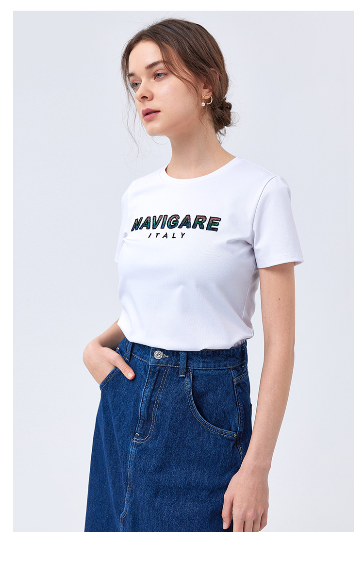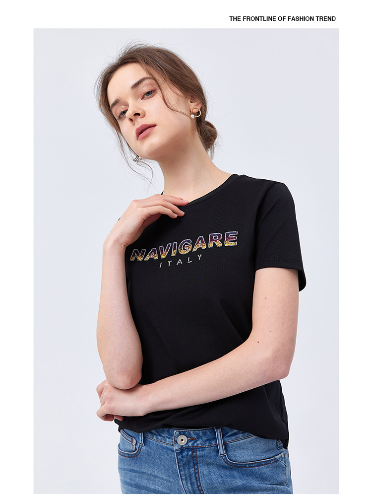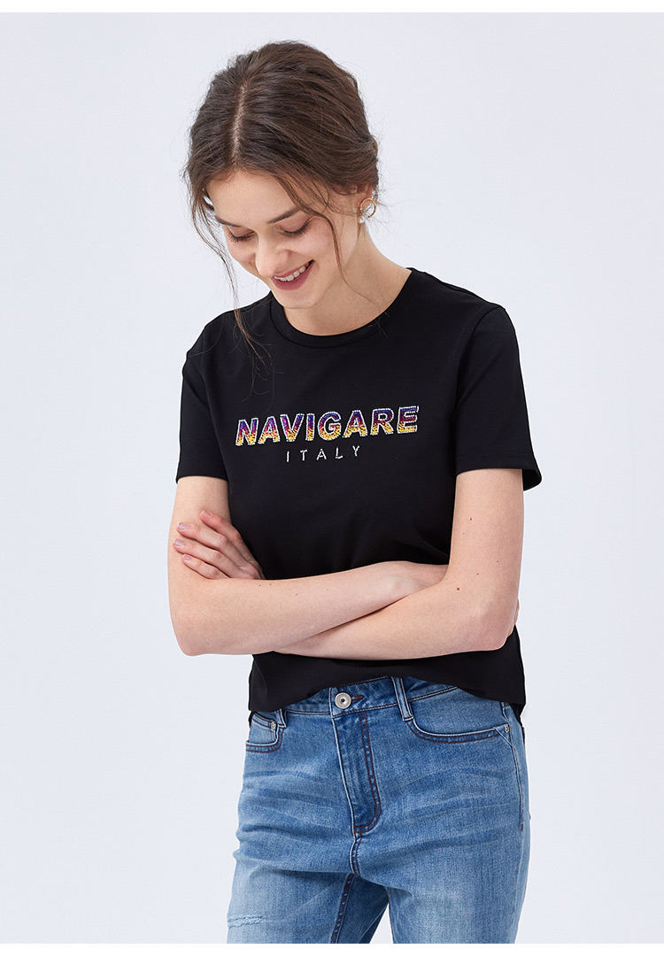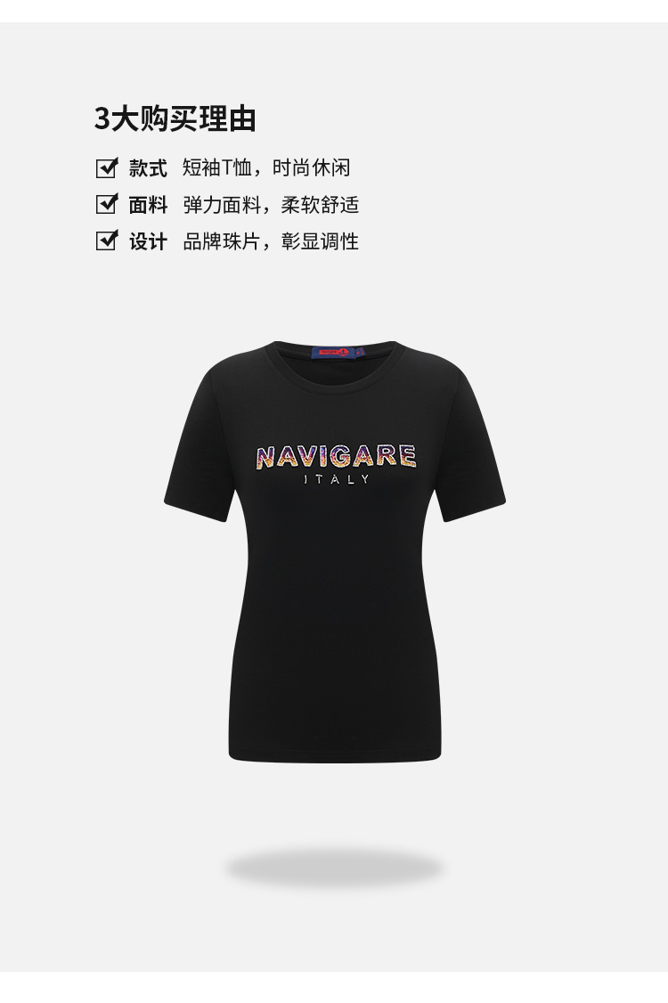 Navigare Ý nhỏ thuyền buồm nữ áo thun ngắn tay 2022 mới mùa hè màu đen cổ tròn đầu chữ