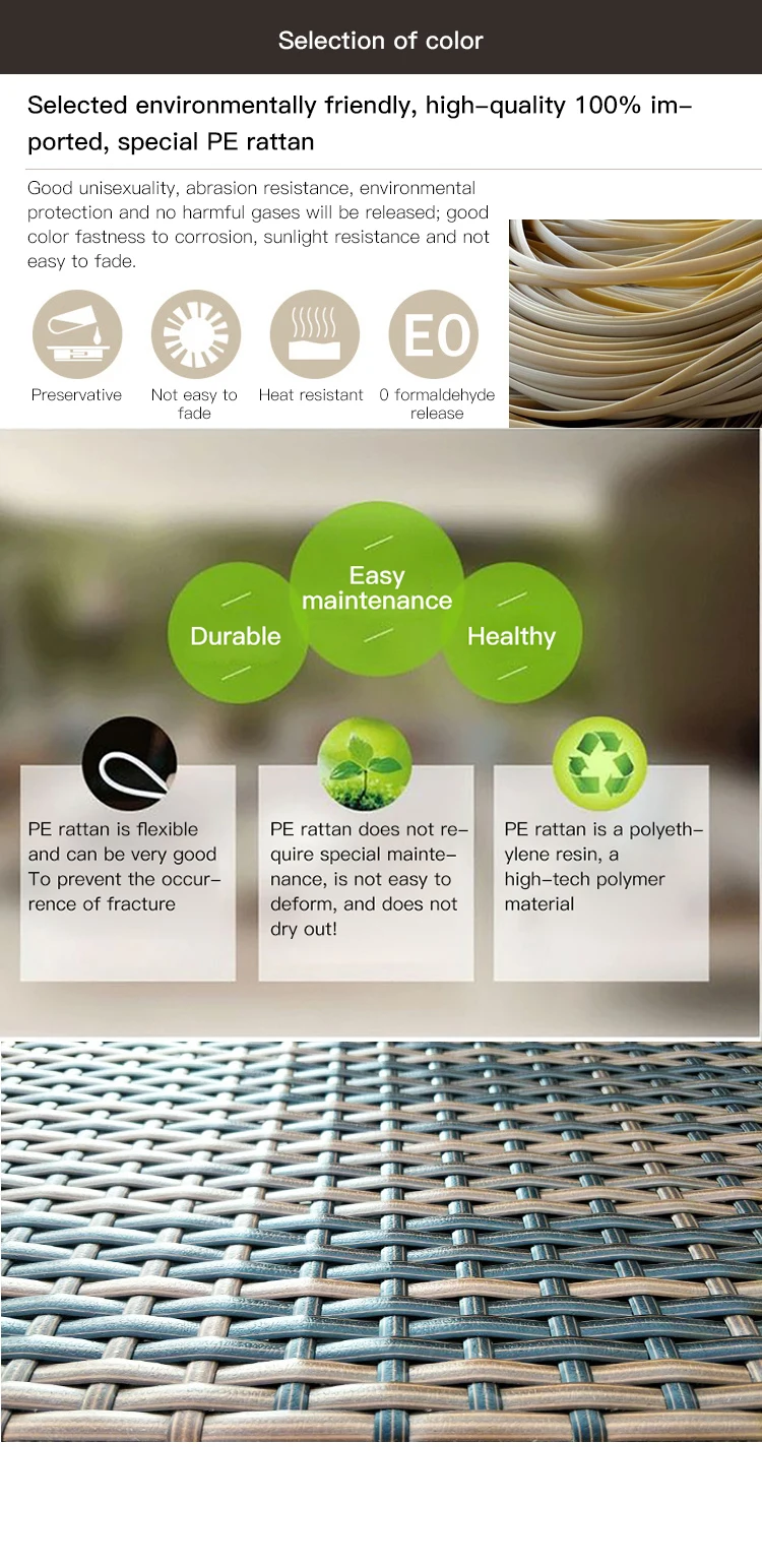 A.Imported PE rattan, strong toughness, special resistance to lass, good abrasion resistance, resistance to rain and sun, anti-aging, durable.