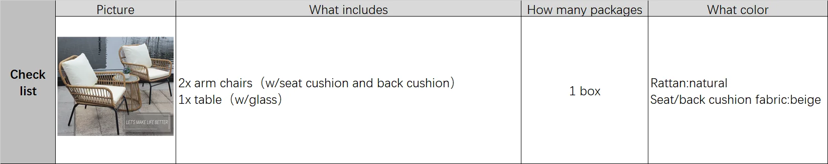 · 3-Pieces Patio Set – This outdoor set is composed of 2 armchairs and a circular accent table to place small decor, snacks, and beverages.The design has contemporary appeal, extra wide seat width and depth perfect for your body. It is perfect addition for the pool, park, the garden and the country yard;