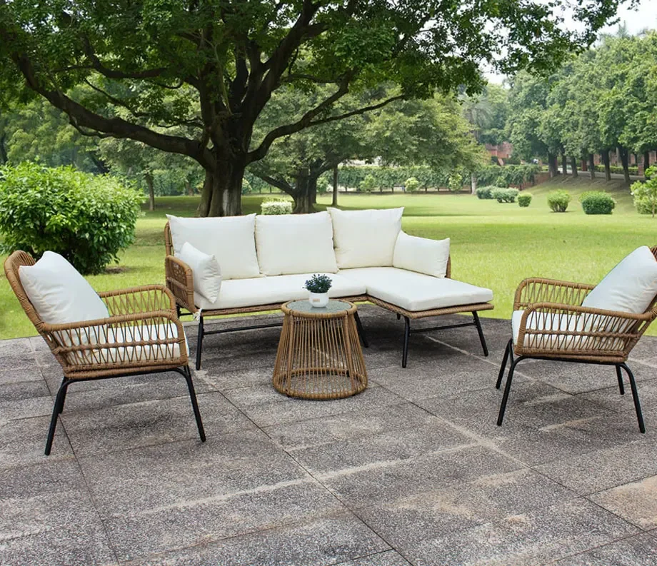 Ngoại thất sân vườn Ngoài trời Sân hiên Ban công Ghế hình chữ L Màu sắc tự nhiên Bộ ghế sofa đan lát với đệm màu be và bàn kính cường lực tròn là lựa chọn lý tưởng cho không gian công cộng, sân vườn hoặc khu đô thị. Sản phẩm giúp nâng cao hình ảnh chuyên nghiệp và sạch đẹp cho môi trường sống.