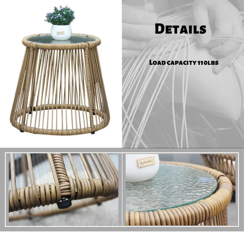 with comfortable sponge seat cushions for long-lasting use. Elegant matching side table included with a tempered top for easy cleaning so you can set down your plate or coffee mug without staining.