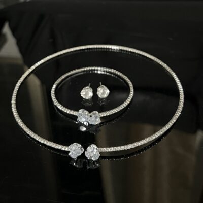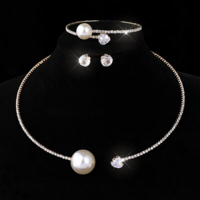 【宝贝名称】外贸新款珍珠桃心满钻项圈欧美跨境新娘水钻手镯耳环项链三件套装
