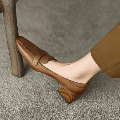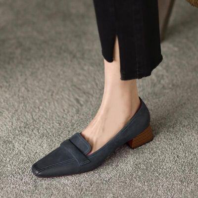 Ngoại thương xuất khẩu mùa xuân giày đơn của phụ nữ lớp đầu tiên của da cừu nhỏ giày đế vuông mũi vuông màu xanh giữa miệng dày gót trung bình giày da nhỏ