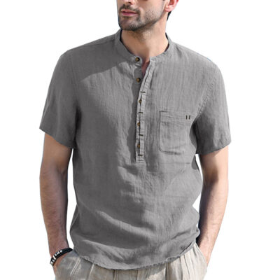 Ngoại thương xuất khẩu nam Henry cổ áo sơ mi ngắn tay màu trơn Amazon Nguồn bán buôn áo sơ mi cotton và vải lanh nam Âu Mỹ