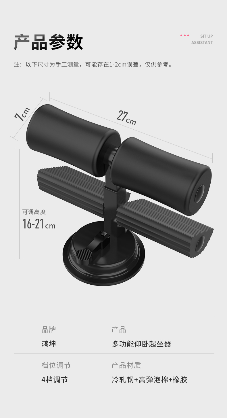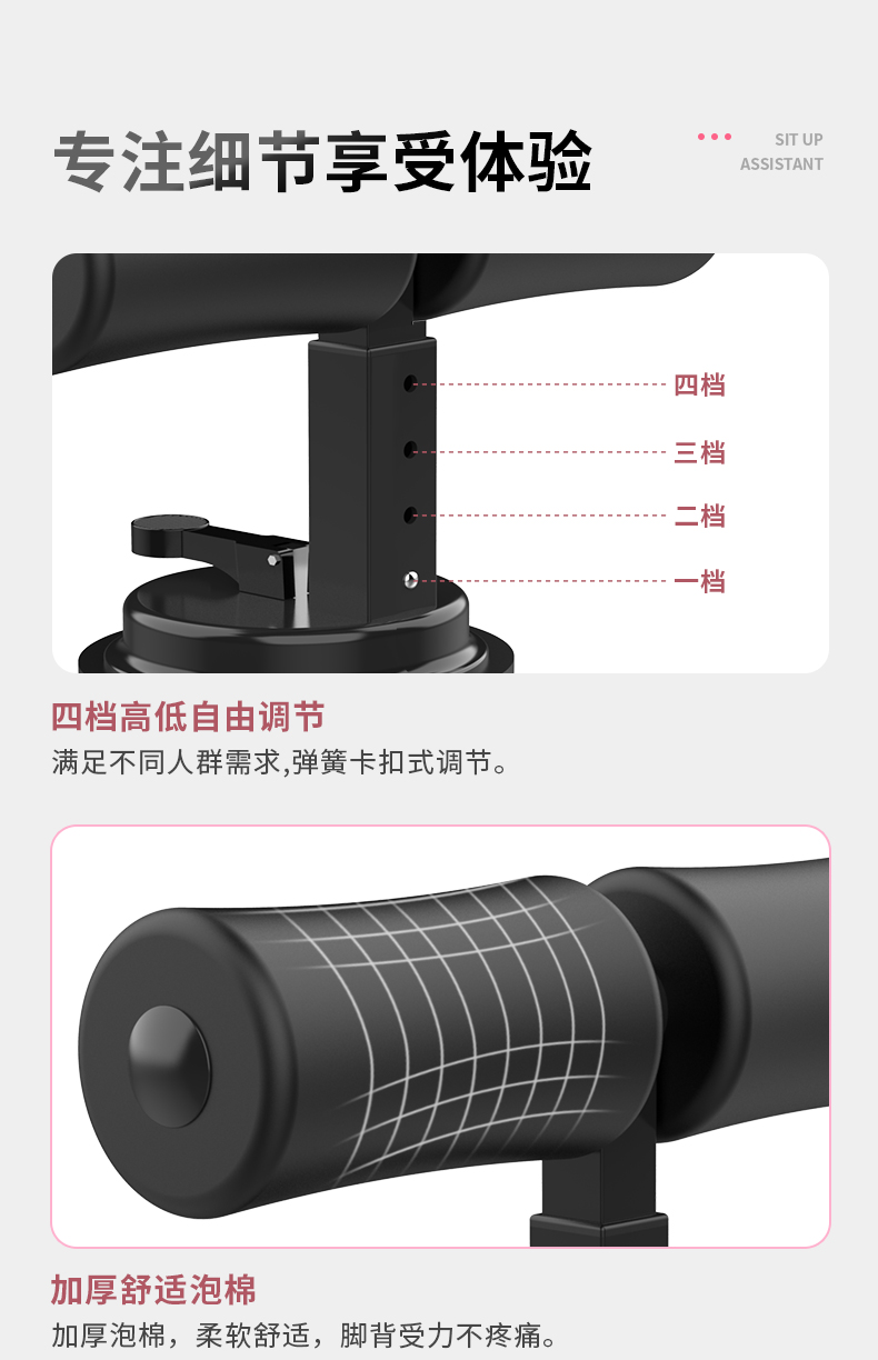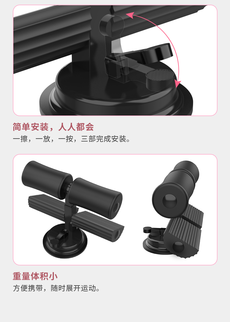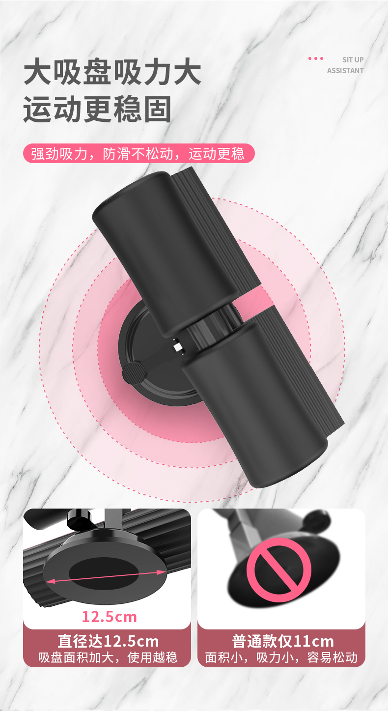 这个地盘吸的特别紧,新型仰卧起坐器,升级支撑杆,效率加倍,今天才收到,很多功能锻炼,手臂,腿部,腹部都是可以的,而且价格实惠。 三档高度调节,满足不同需求,外观简单大方,而且还可以任意调节,大人小孩都是可以锻炼的,满意。做了几个也很给力。性价比高,一个人在家里空闲下来可以做做运动,挺不错的哦