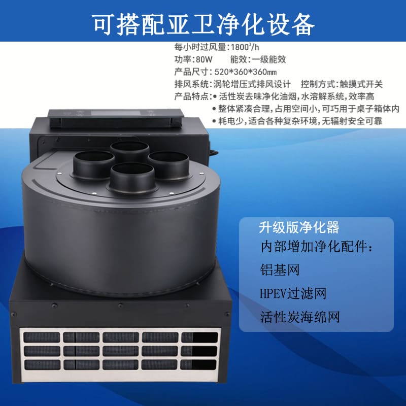 产品配置:有下排烟接口,可接地下管道排烟;