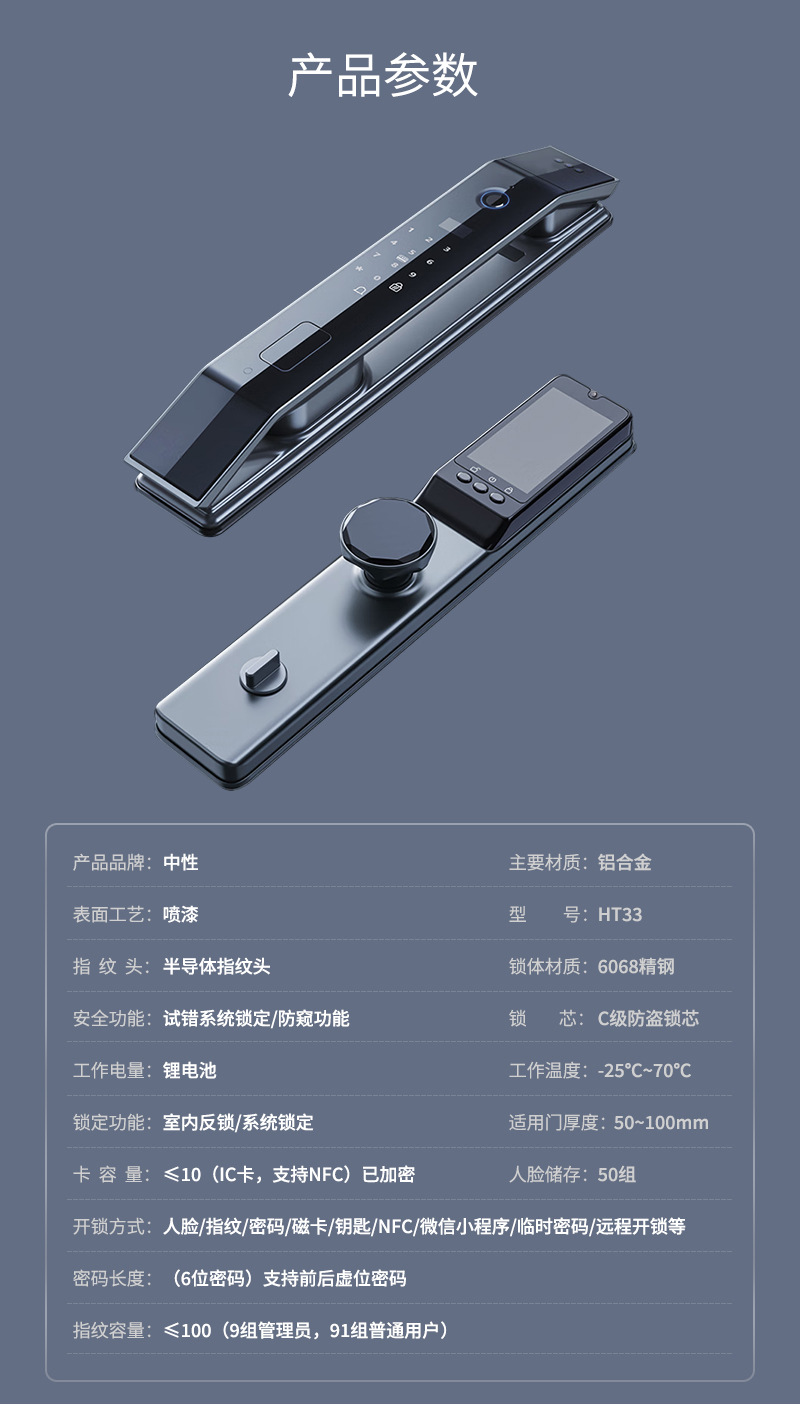 Dung lượng lưu trữ vân tay: 100 Mã sản phẩm: HT33 Thương hiệu: Trung lập Tuổi thọ: 8 năm Nguồn điện: DC Model: HT33 Thời gian quét <: 0,5 Phạm vi ứng dụng: Cửa gỗ Cửa an ninh Cửa hợp kim nhôm Thông số kỹ thuật: Mô hình nhận dạng khuôn mặt 3D + Pin Lithium (Bao gồm thân Khóa) / Mô hình nhận dạng khuôn mặt 3D + pin lithium (không bao gồm thân khóa) / Mô hình nhận dạng khuôn mặt 3D + pin lithium (không bao gồm thân khóa) Tỷ lệ nhận dạng sai <: 0,001% Có giao hàng đến tận nhà hay không: có giao hàng tận nơi hay không điểm đón Cung cấp dịch vụ lắp đặt: Có Phương pháp so sánh: 1:1 Nhiệt độ làm việc: -20°C-85°C Độ ẩm làm việc: -40°C-85°C Xử lý và tùy chỉnh: Có Tỷ lệ từ chối <: 3% Cho dù có chéo -nguồn cung cấp đặc biệt xuất khẩu đường viền: Không có Phong cách: Sang trọng nhẹ Phong cách: Vân tay/Mật khẩu/Bằng chìa khóa/Lỗ nhìn trộm trực quan/Nhận dạng khuôn mặt/Mở khóa từ xa/Mở khóa từ xa Số lần mở khóa >: 10000