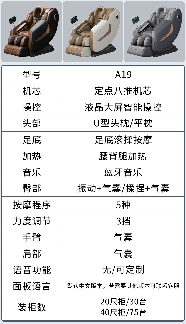Thương hiệu: Jianhui Mã hàng: A19B Loại chuyển động: Massage đa điểm Cho dù điều khiển thông minh: Có Danh mục sản phẩm: Ghế massage tại nhà Màu sắc: Cà phê/Xám/Xám Chất liệu vải: Da PU Loại đường ray: Đường ray thẳng Model: A19B Số lượng túi khí: 30 Nguyên tắc massage trở xuống: chức năng áp suất không khí: chức năng hẹn giờ/âm nhạc/điều khiển dây cầm tay/điều khiển dây cầm tay Phương pháp lắp đặt: đúc một mảnh, không cần cài đặt