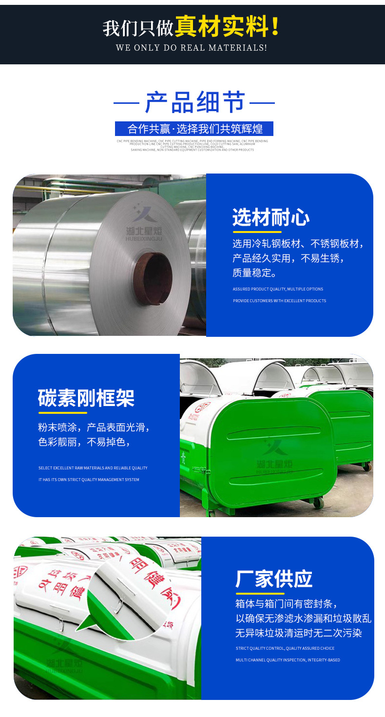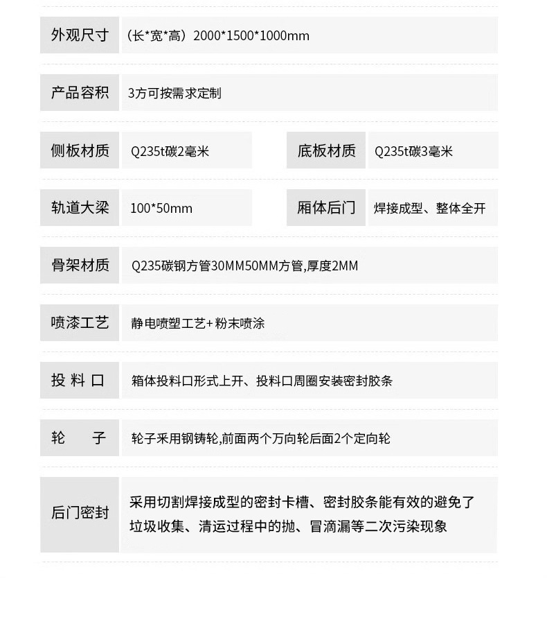 Nơi xuất xứ: Tô Châu, tỉnh Hồ Bắc Trọng lượng: 350kg Mã hàng: 3m3-001 Thương hiệu: Xingju Chất liệu: Thép carbon Kích thước: 2000 * 1500 * 1000 Độ dày: 2 Thông số kỹ thuật: Thùng rác / thùng rác 3 cánh tay móc có logo tùy chỉnh miễn phí /phụ kiện thùng rác/Xử lý và tùy chỉnh phụ kiện Hộp rác: hỗ trợ nhiều hình thức tùy chỉnh khác nhau