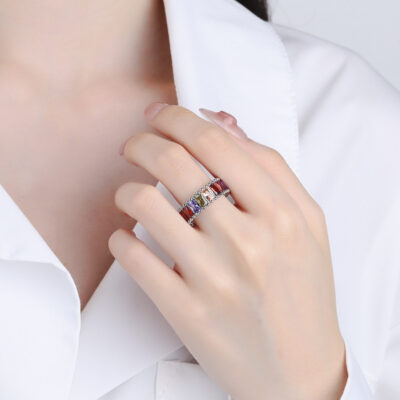 Nhẫn cầu vồng kim cương vuông sang trọng cao cấp xuyên biên giới châu Âu và châu Mỹ Dongdaemun tính khí màu kim cương mở trang sức nhẫn nữ