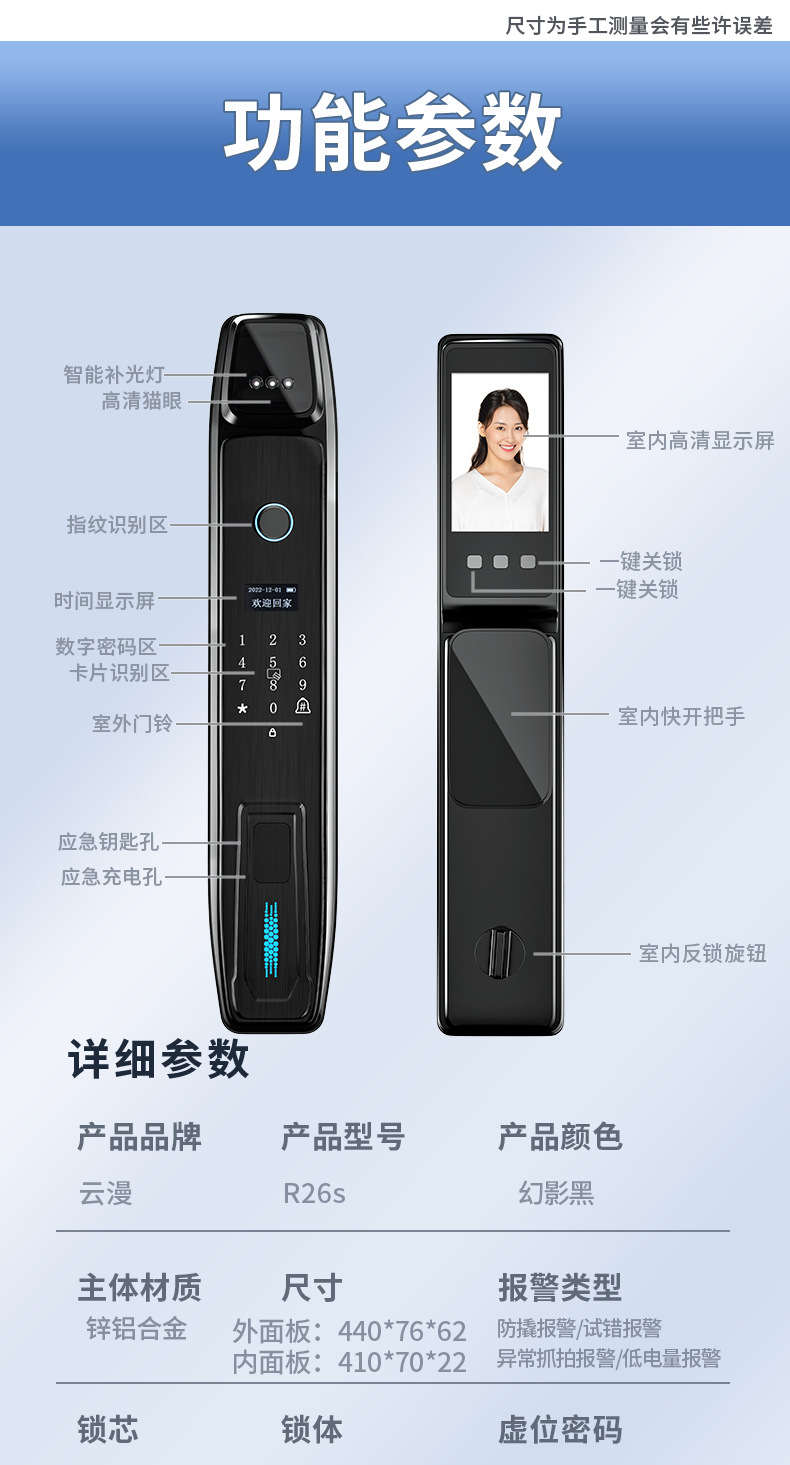 Dung lượng lưu trữ vân tay: 100 Mã sản phẩm: R26S Thương hiệu: Yunman Tuổi thọ: 5000 Nguồn điện: DC Model: R26S Thời gian quét <: 5000 Phạm vi ứng dụng: Cửa ra vào, cửa an ninh, cổng, cửa thép không gỉ Thông số kỹ thuật: Model cơ bản R26S/R26S mắt mèo Mô hình giám sát/Mô hình nhận dạng khuôn mặt R26S/Mô hình nhận dạng khuôn mặt R26S Tỷ lệ nhận dạng sai<: 1 Có giao hàng tận nơi không: Giao hàng xuống tầng dưới Có cung cấp dịch vụ lắp đặt hay không: Không Phương pháp so sánh: 1:N Nhiệt độ làm việc: -10- 50 Độ ẩm làm việc: 10-90 Tùy chỉnh xử lý: Không Tỷ lệ từ chối <: 1 Cho dù nguồn cung cấp độc quyền xuất khẩu xuyên biên giới: Không Phong cách: Hiện đại và đơn giản Phong cách: Vân tay/mật khẩu/có chìa khóa/lỗ nhìn trộm trực quan/nhận dạng khuôn mặt/không mở/từ xa Số lần mở khóa/mở khóa từ xa >: 50000000