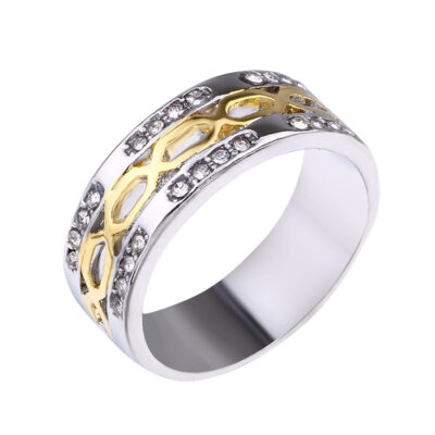 Nhẫn hai màu quốc tế Sanjie mạ vàng dát kim cương giả Nhẫn nam châu Âu và Mỹ trang sức punk