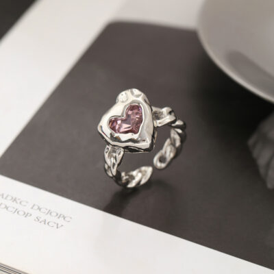 Nhẫn mở tình yêu dát zircon hồng thích hợp nhẫn kim loại nữ ngọt ngào mát mẻ khảm đá quý màu hồng nhẫn