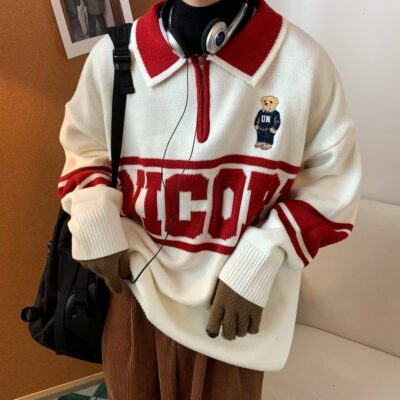 Nhật Bản Retro Chữ Cổ Polo Nửa Dây Kéo Áo Len Dệt Kim Nam Rời Thu Đông BF Gió Top Áo Khoác Chui Đầu