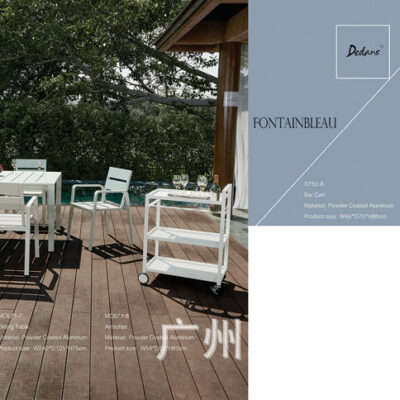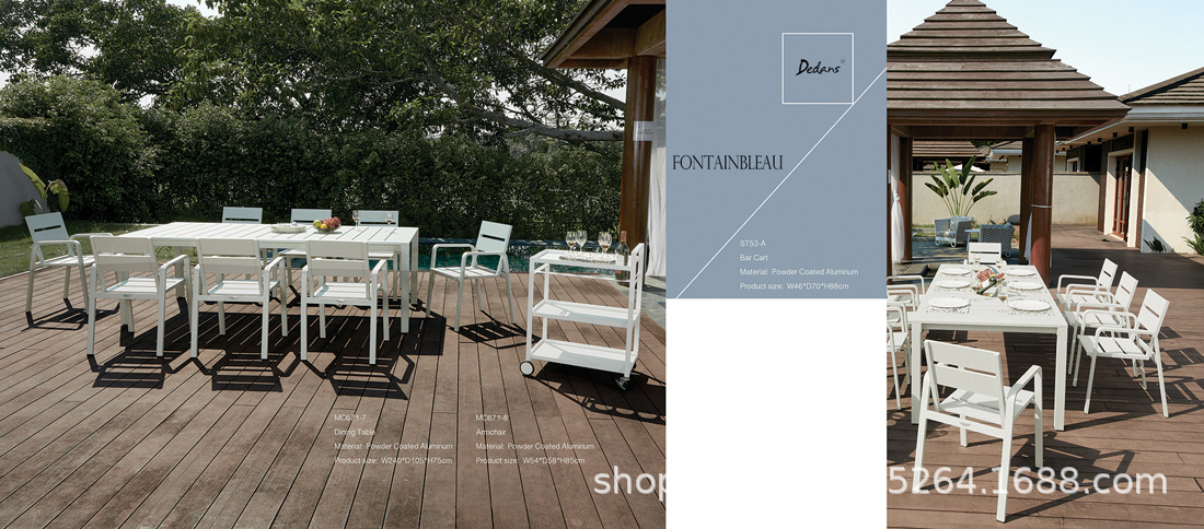 Nội thất Danduo Bộ bàn ăn hợp kim nhôm chữ nhật ngoài trời Fontainebleau Nội thất sân vườn Biệt thự Bàn ghế sân vườn 枫丹白露长方形铝合金餐台系列 少即是多,枫丹白露户外餐厅系列以自己的方式诠释了这一概念。这是一个纯铝的餐 桌 系列,没有复杂的细节 , 它给人一种简单和纯洁的感觉,低调,经得起时间的考验。餐桌和餐椅使用宽宽的铝条,搭配一个迷你酒吧推车,可以为你的家人和朋友提供 饮品和食物 。铝制桌椅重量轻,移动方便,只需最 简易 的维护和清洁, 就可以拥有超长的 使用寿命。 产品说明 型号 描述 尺寸 (cm) MC671-7 长方形餐桌 240 W x 105 D x 75 H MC671-8 扶手椅 54 W x 58 D x 85 H ST53-A 餐车 46 W x 70 D x 88 H 产品细节 : 1. 既时尚又永恒的餐桌和餐椅都是铝合金制造的; 2.裸露的餐桌和餐椅表面都喷上专业的 TIGER ® 涂层; 3.干净整洁的粉白色传递着纯洁的氛围; 4.椅子设计符合人体工程学,座椅和靠背之间留有适当的开放空间,加上圆角扶手,提供更舒适的体验感; 5.每张桌子搭配 8 张椅子。为了运输方便,做成 K.D. 结构,同时配备安装工具和螺丝; 6.餐椅在不使用时可以叠起来节省空间; 7.这个餐饮系列可搭配迷你餐车,可以提供饮品或者食物给客人; 8.铝制家具性能稳定,即使在户外使用也不需要特殊保养护理; 9.保质期: 3 年。 Mã sản phẩm: MC671 Thương hiệu: Danduo Màu sắc: Bàn ăn/Ghế ăn/Xe đẩy quầy bar/Xe đẩy quầy bar Model: MC671 Phương pháp gia công: Sản xuất độc lập Thông số kỹ thuật: 2,4 mét Có giao hàng tận nơi không: Không Giao hàng tận nơi Có cung cấp dịch vụ lắp đặt hay không : Không Nền tảng hạ nguồn chính: Khác Có phải là người nộp thuế chung không: Có Chất liệu: Hợp kim nhôm Kích thước: 240*105*75/54*58*85/46*70*88/46*70*88 Cho dù đó là xuyên biên giới nguồn cung cấp độc quyền xuất khẩu: Có Khu vực bán hàng chính: Châu Phi/Châu Âu/Nam Mỹ/Đông Nam Á/Bắc Mỹ/Đông Bắc Á/Trung Đông/Trung Đông Phong cách: Hiện đại và Đơn giản