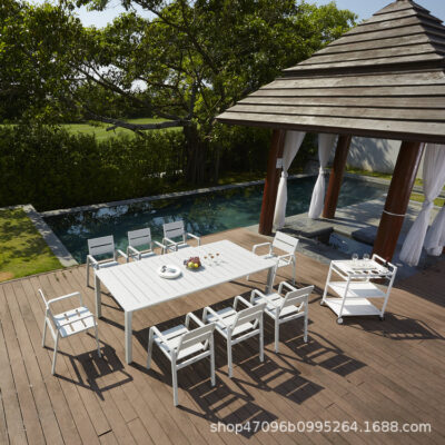 Nội thất Danduo Bộ bàn ăn hợp kim nhôm chữ nhật ngoài trời Fontainebleau Nội thất sân vườn Biệt thự Bàn ghế sân vườn được thiết kế để tạo điểm nhấn cho khu vực sân vườn, ban công hoặc không gian ngoài trời.