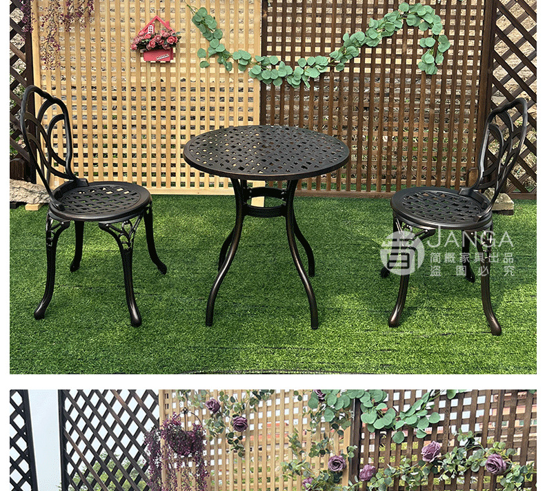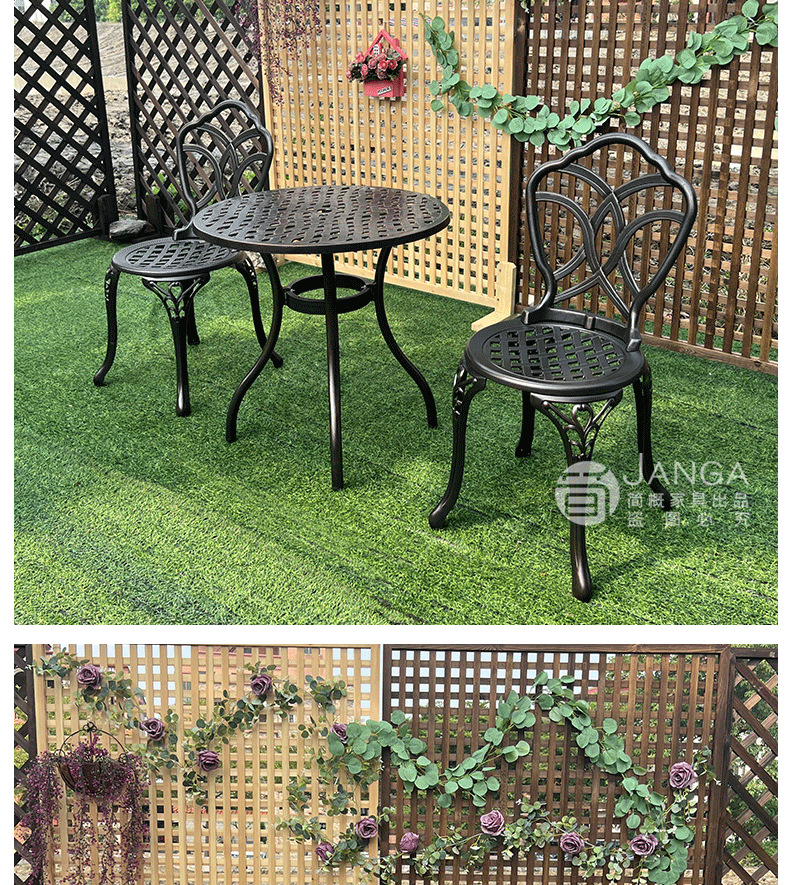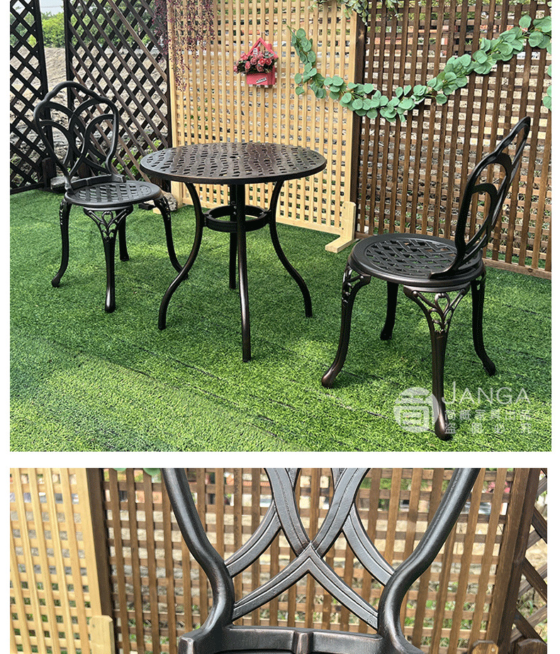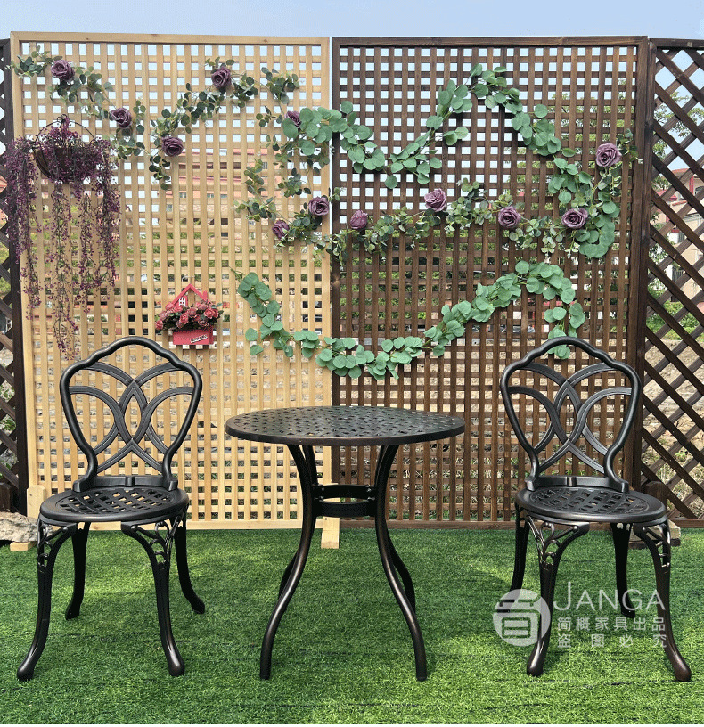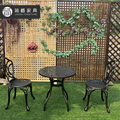 Nội thất giải trí ngoài trời Sân vườn Ban công Sân thượng Bàn ghế kim loại Công viên ngoài trời Cộng đồng Nhôm đúc Một bàn hai ghế được thiết kế để tạo điểm nhấn cho khu vực sân vườn, ban công hoặc không gian ngoài trời.