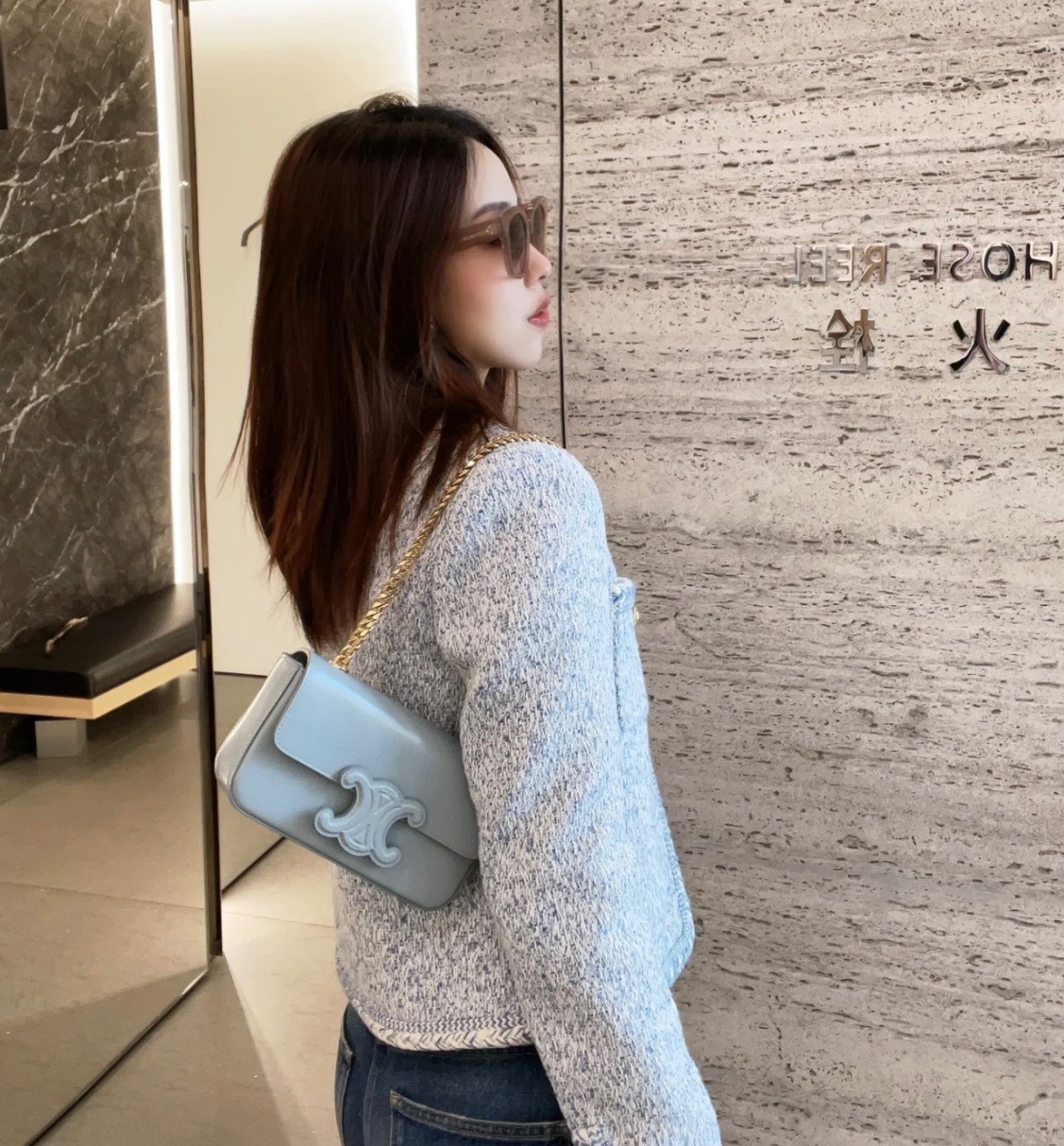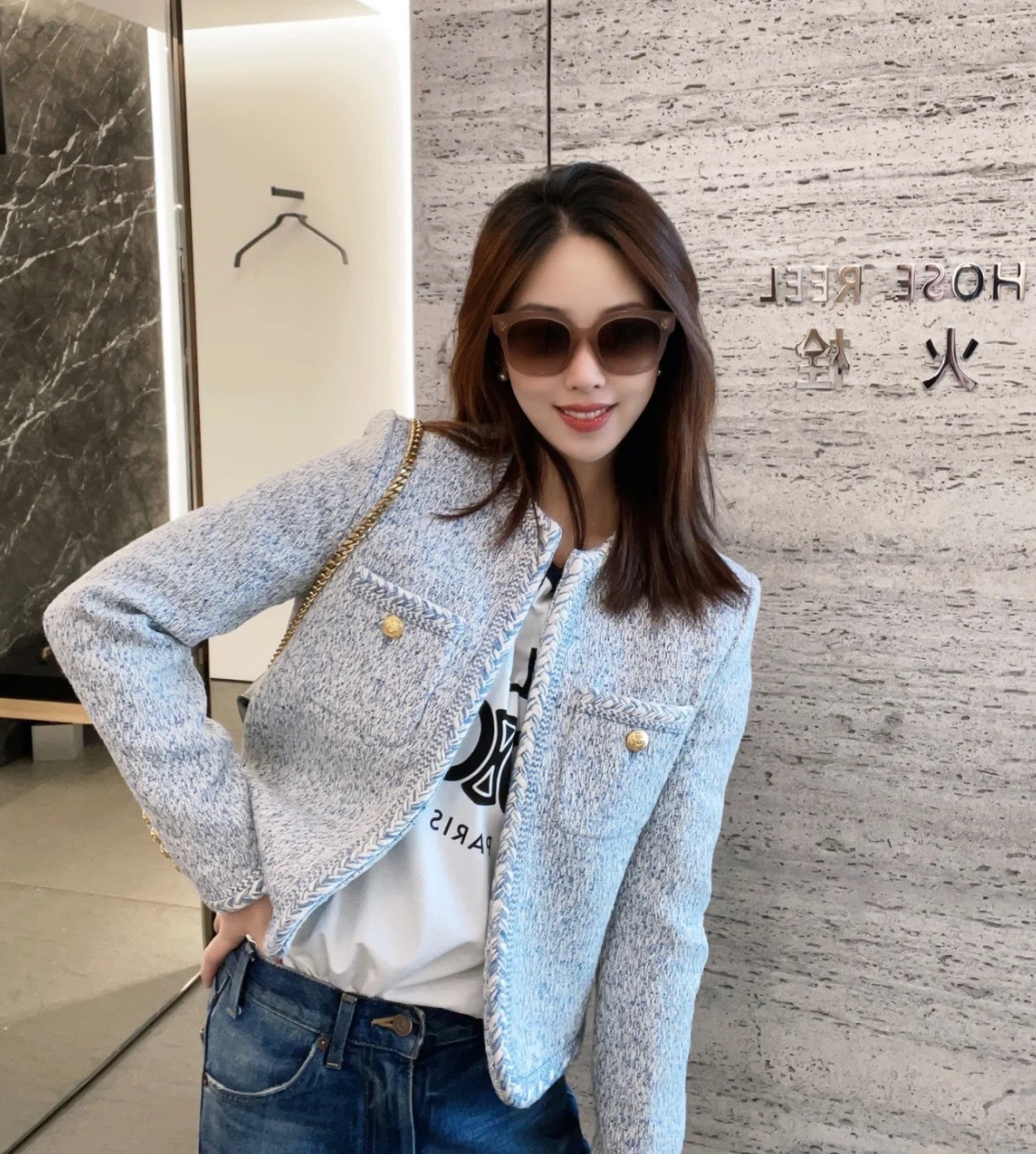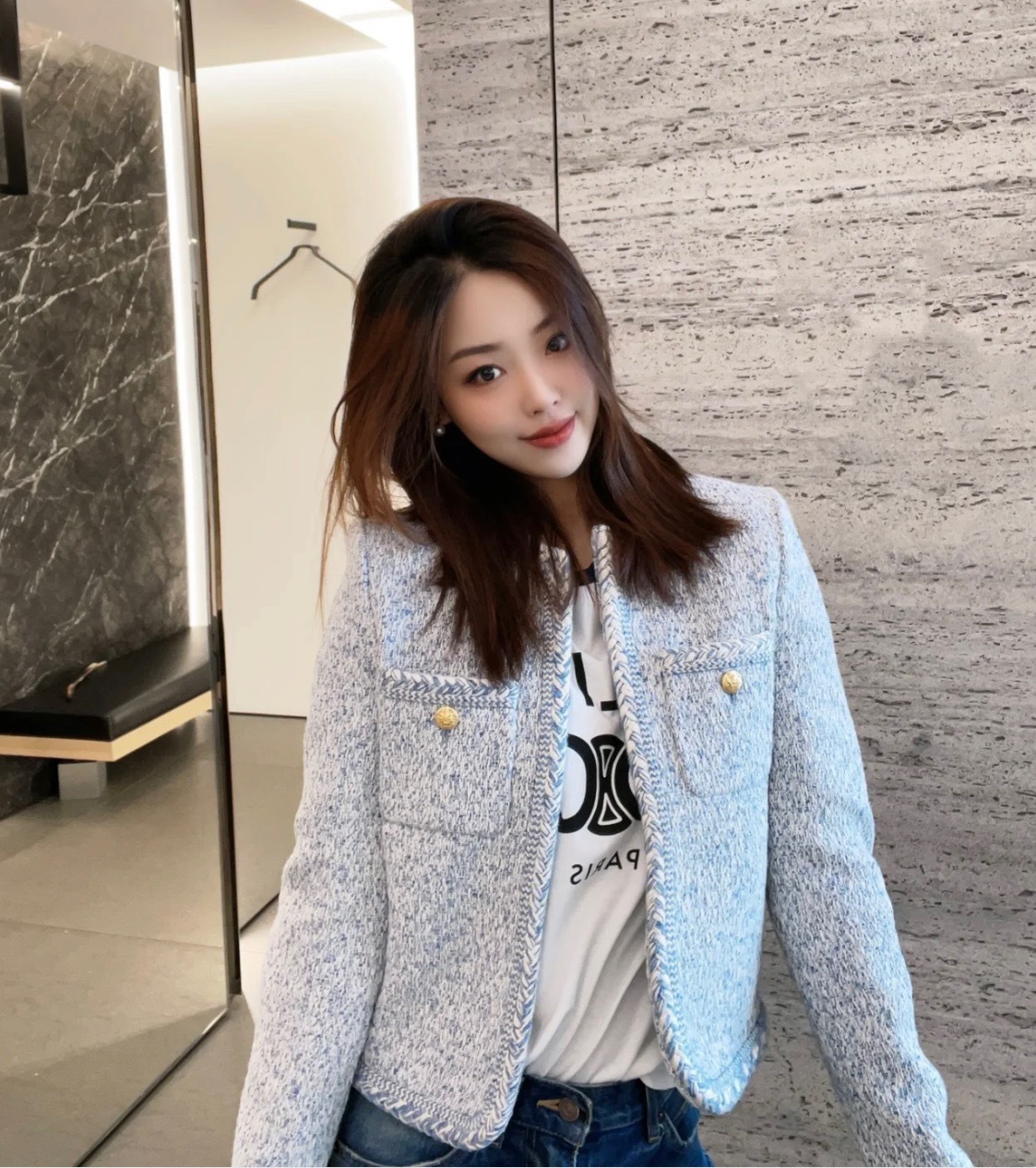 Phiên Bản Đúng CE Mùa Xuân 2023 Quần Áo Nữ Mới Sông Băng Màu Xanh Nhỏ Hương Len Săn Bắn Áo Khoác Cardigan