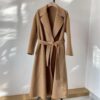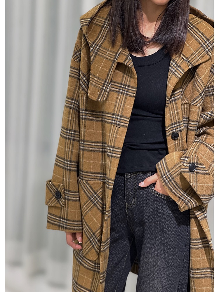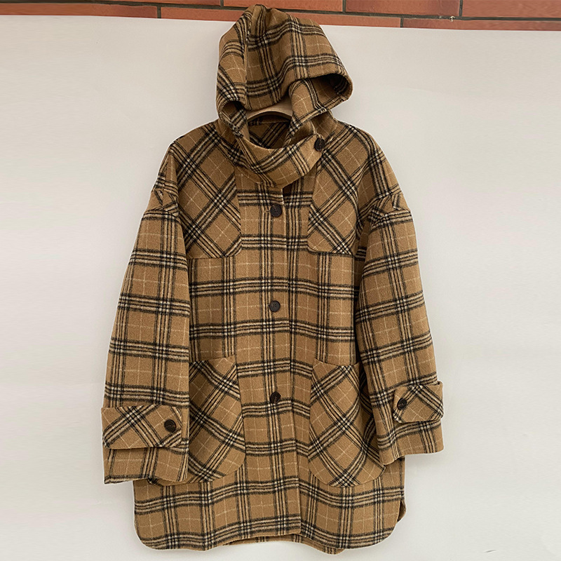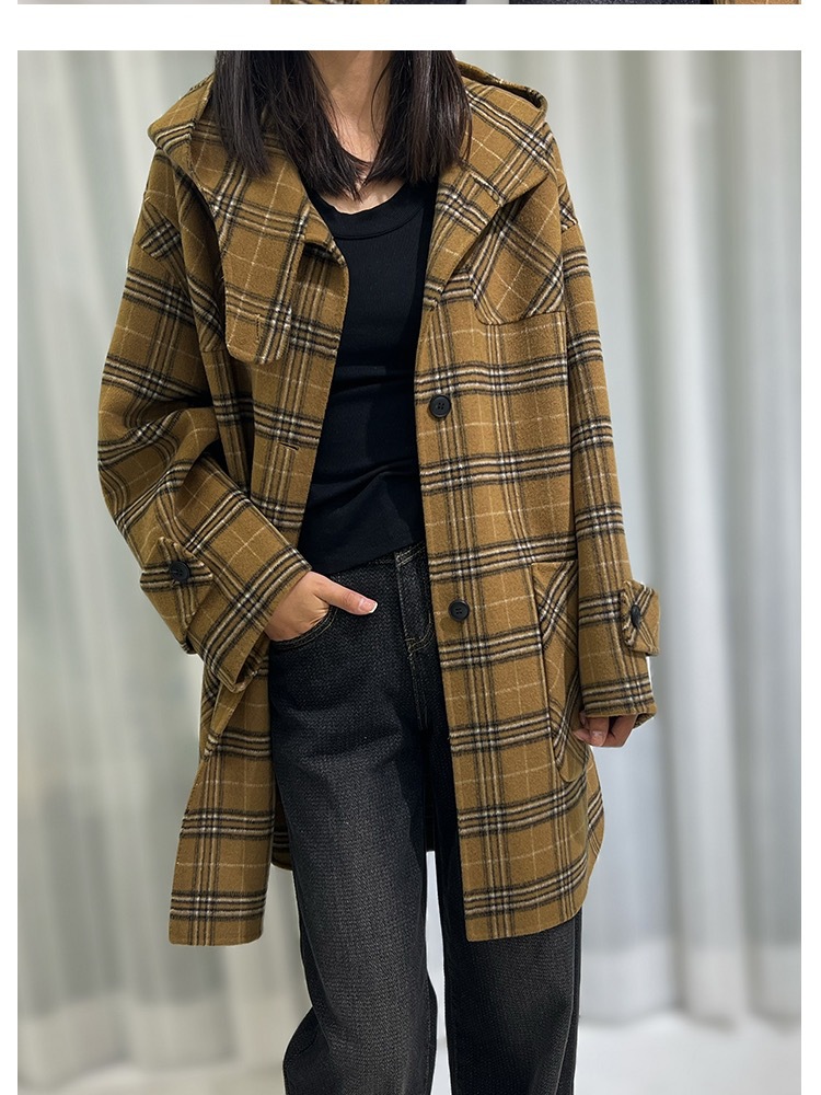 Phiên bản Hàn Quốc Áo khoác cashmere kẻ sọc hai mặt có mũ trùm đầu dành cho nữ có độ dài trung bình giảm tuổi Áo khoác len Úc mùa thu đông