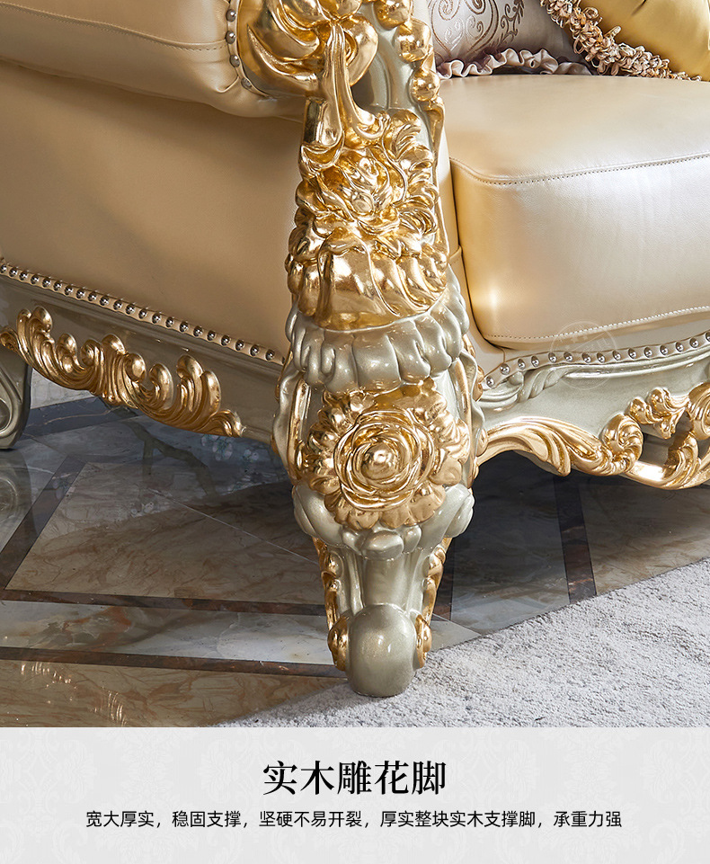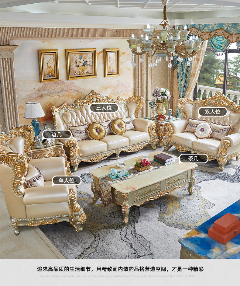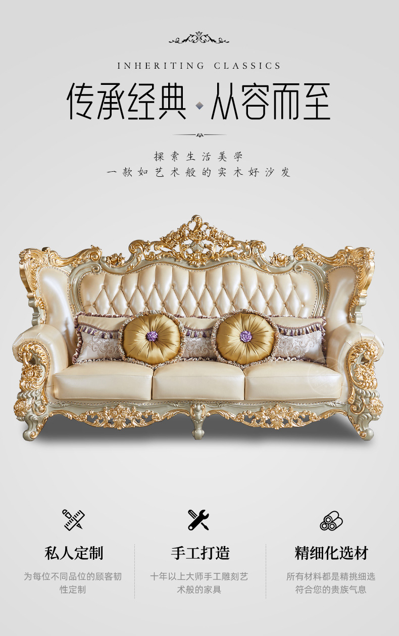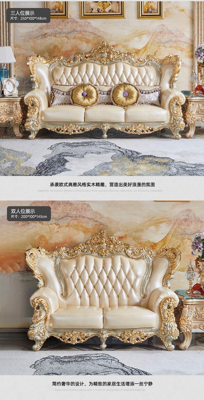Phong cách Châu Âu đầu lớp sofa da kết hợp gỗ nguyên khối chạm khắc sang trọng biệt thự cỡ lớn sofa phòng khách nhà máy bán buôn