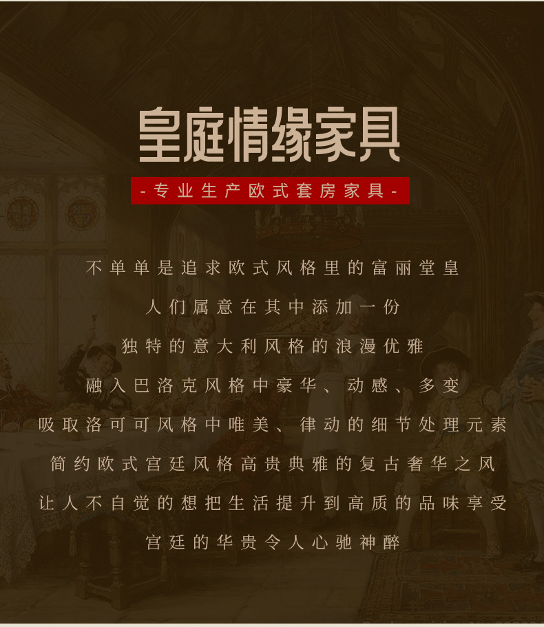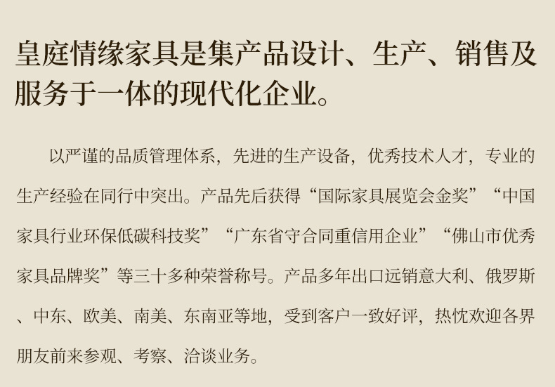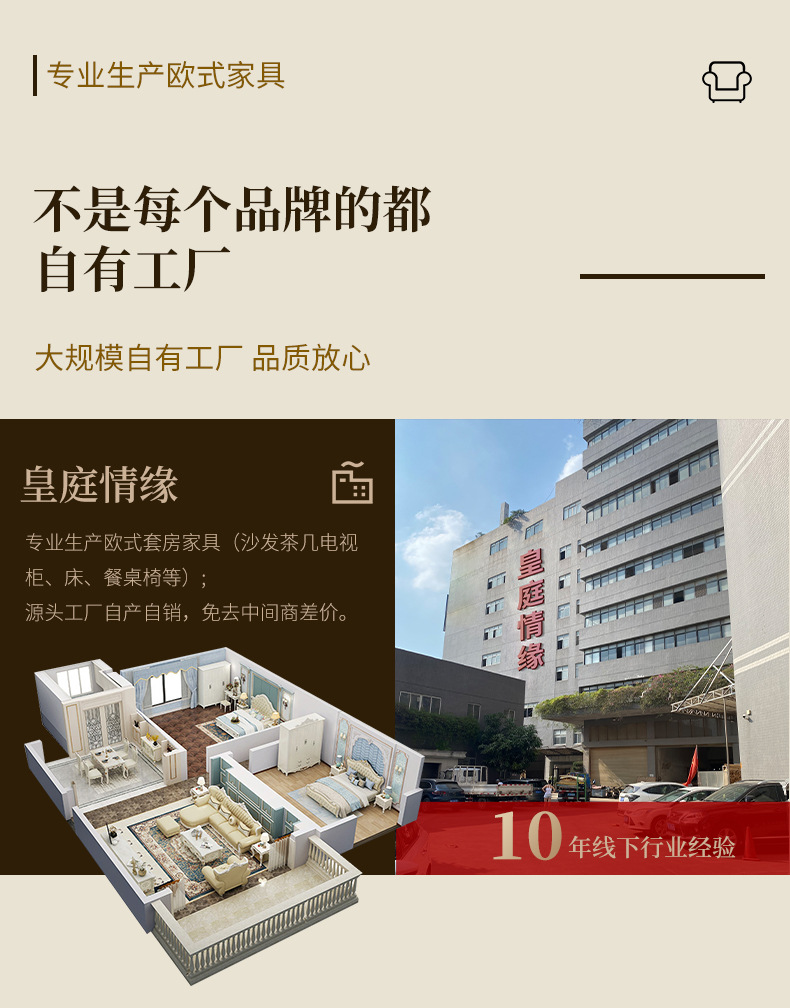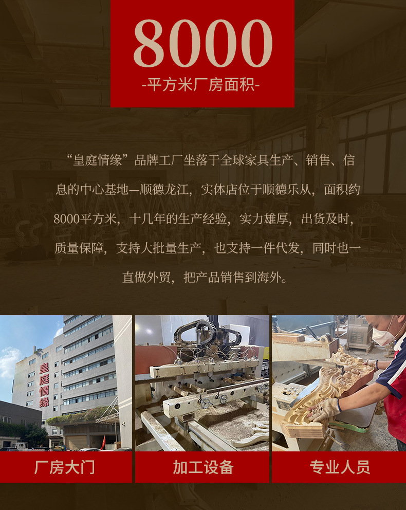 “皇庭情缘”品牌工厂坐落于全球家具生产、销售、信息的中心基地—顺德龙江,实体店位于顺德乐从,面积约8000平方米,十几年的生产经验,实力雄厚,出货及时,质量保障,支持大批量生产,也支持一件代发,同时也一直做外贸,把产品销售到海外。