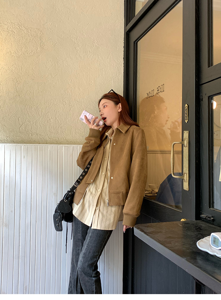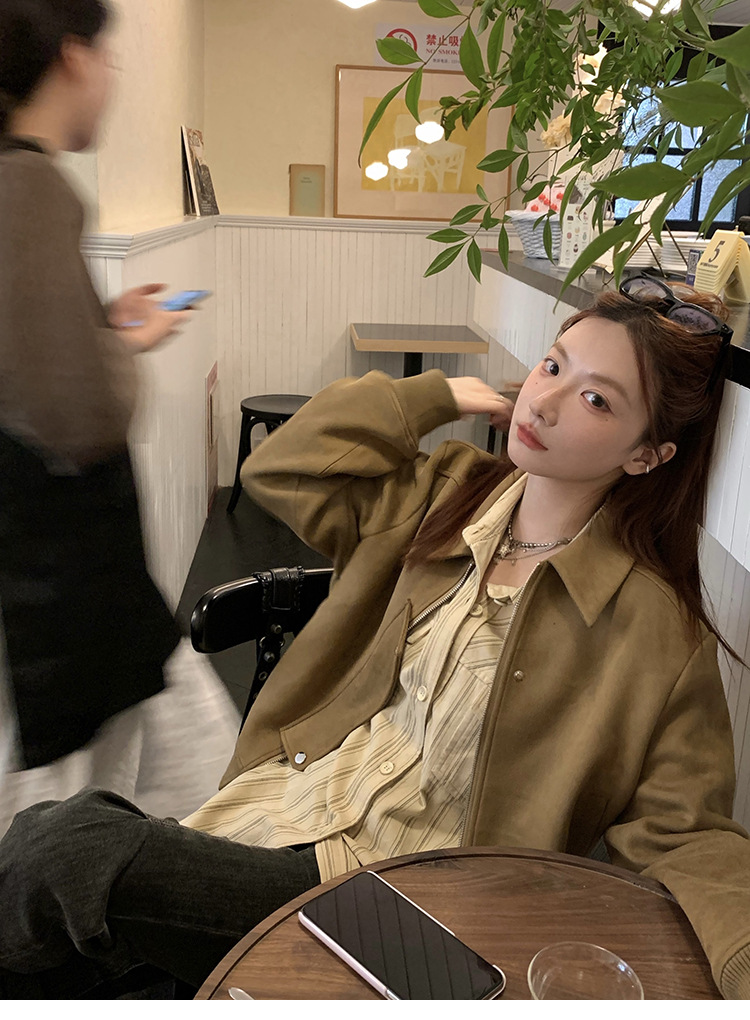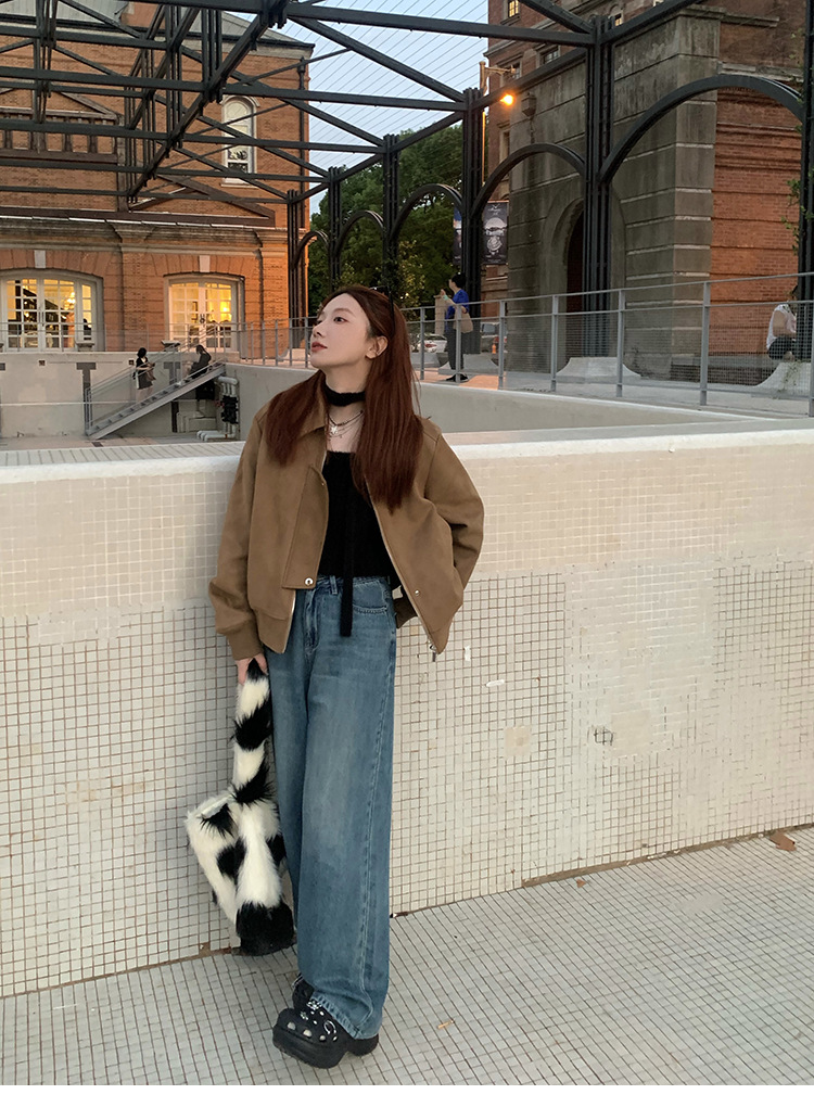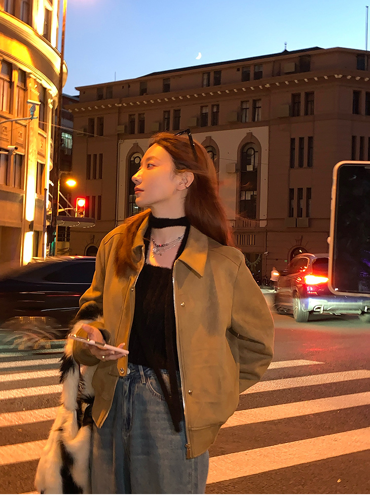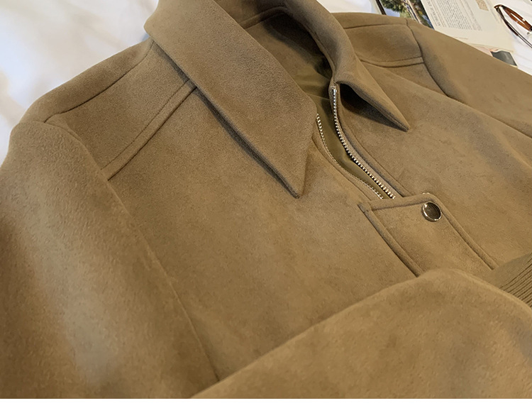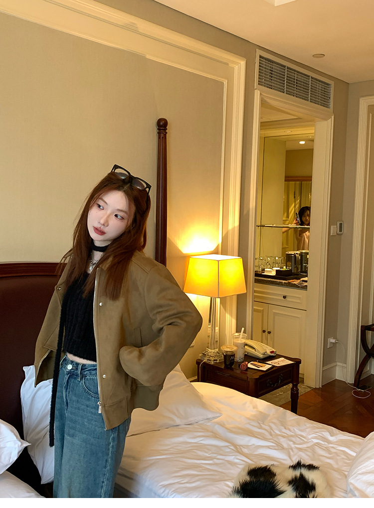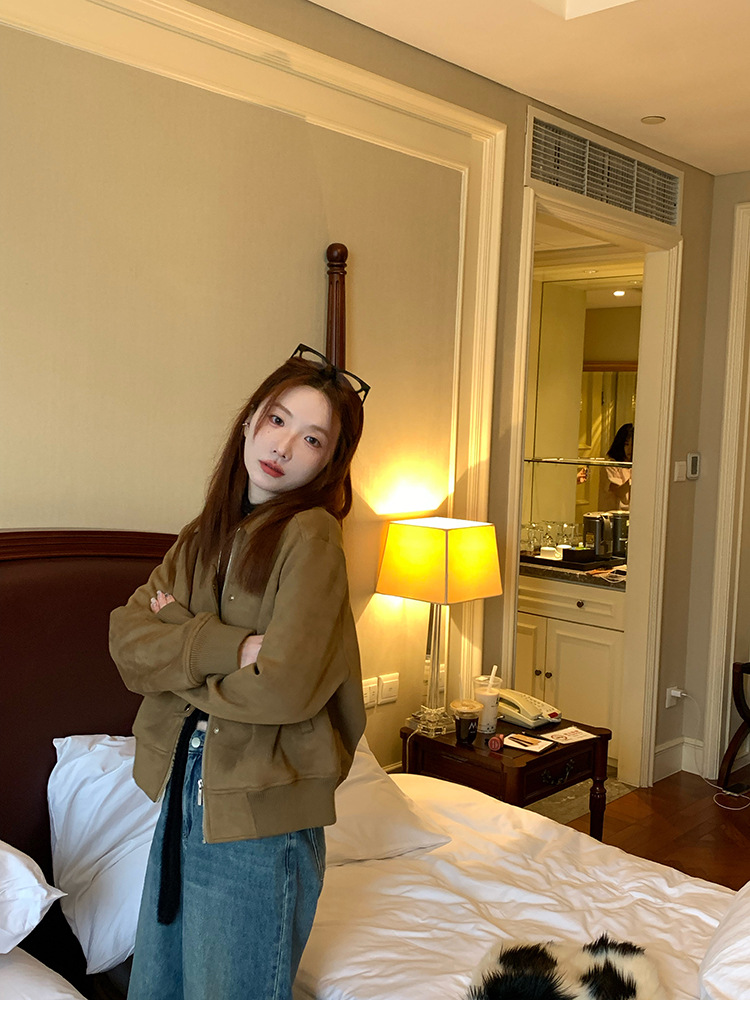 Phong Cách Retro Hippie Dây Kéo Màu Trơn Áo Khoác Da Lộn Phong Cách Ngắn Cho Nữ Mùa Xuân Và Mùa Thu 2023 Dáng Rộng Cổ Tất Cả Trận Áo Khoác Cao Cấp