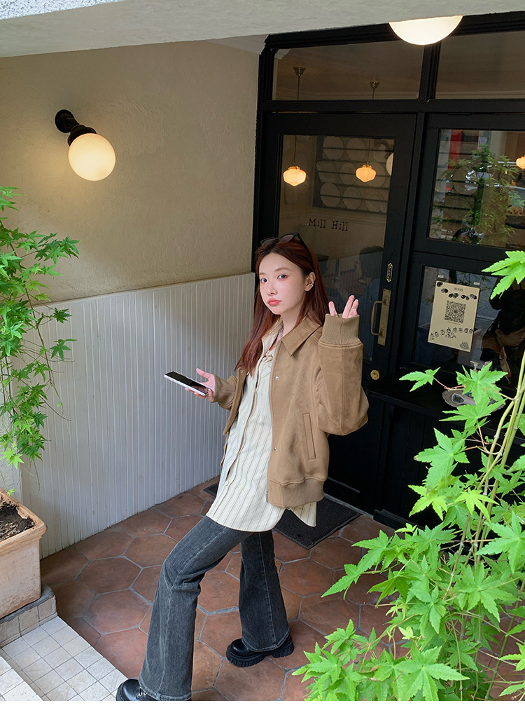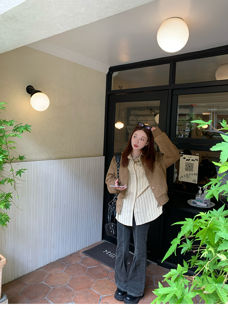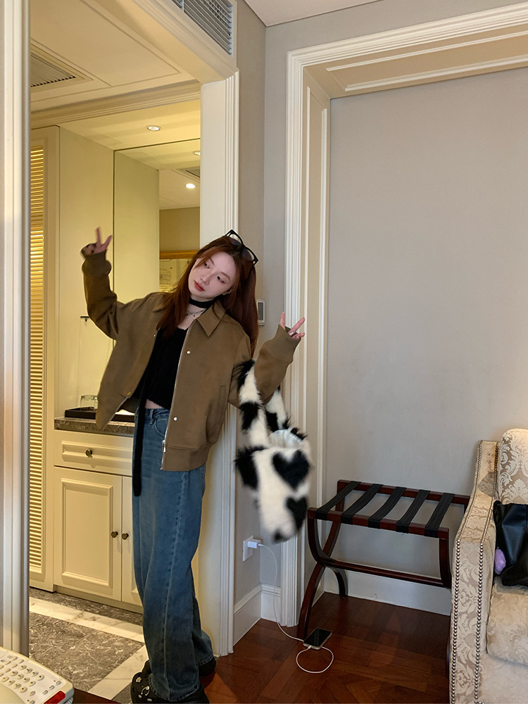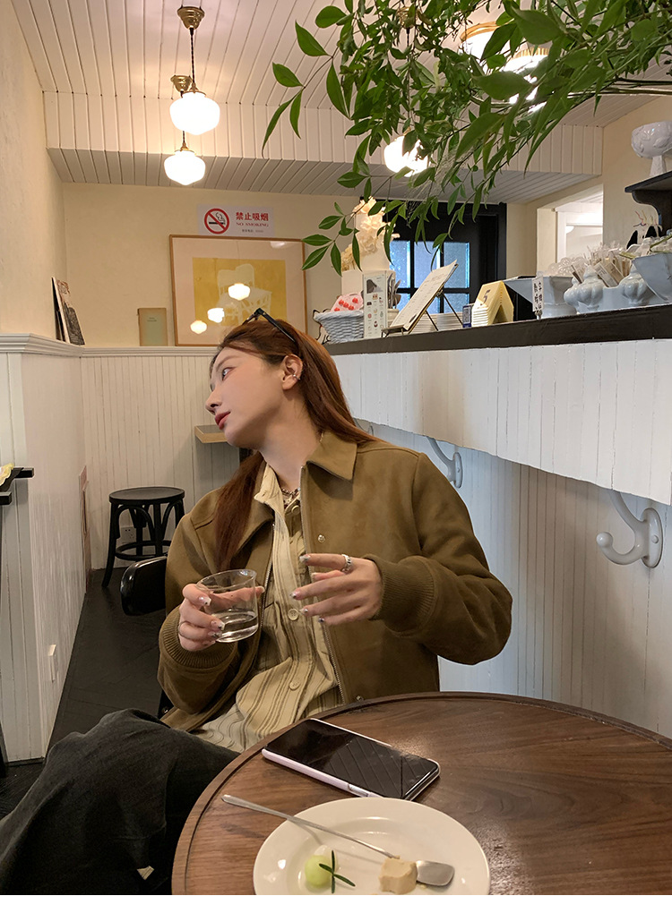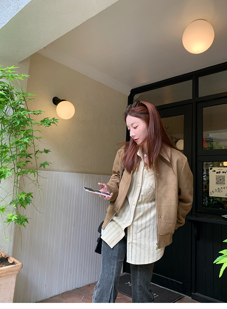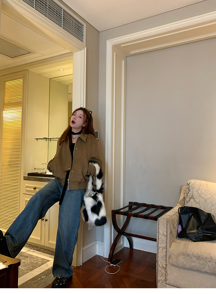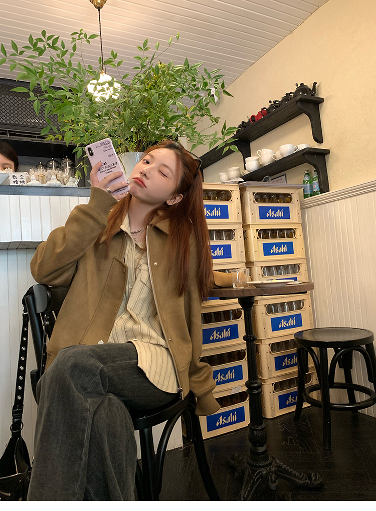 Phong Cách Retro Hippie Dây Kéo Màu Trơn Áo Khoác Da Lộn Phong Cách Ngắn Cho Nữ Mùa Xuân Và Mùa Thu 2023 Dáng Rộng Cổ Tất Cả Trận Áo Khoác Cao Cấp