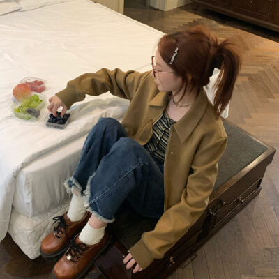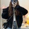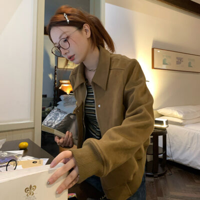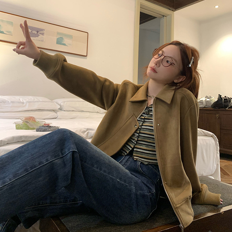Phong Cách Retro Hippie Dây Kéo Màu Trơn Áo Khoác Da Lộn Phong Cách Ngắn Cho Nữ Mùa Xuân Và Mùa Thu 2023 Dáng Rộng Cổ Tất Cả Trận Áo Khoác Cao Cấp