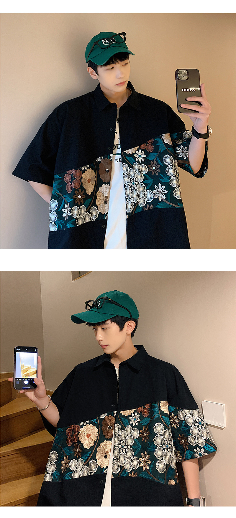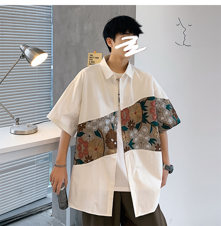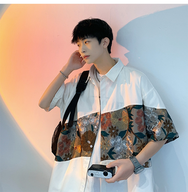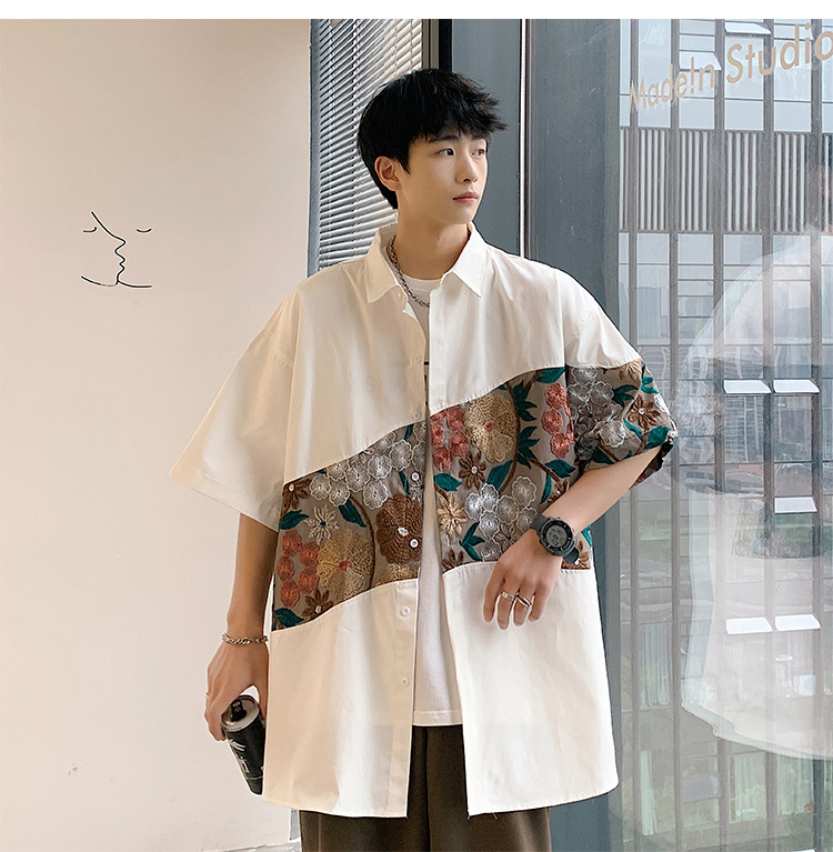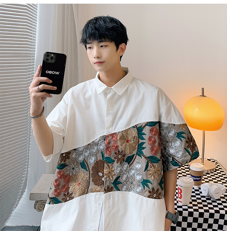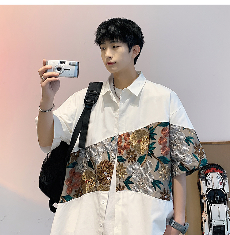 Phong cách trung quốc nam cao cấp cảm giác lưu manh đẹp trai áo sơ mi hoa mùa hè nam quốc triều thương hiệu thêu áo sơ mi ngắn tay áo khoác nam người mẫu