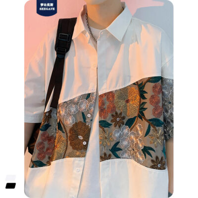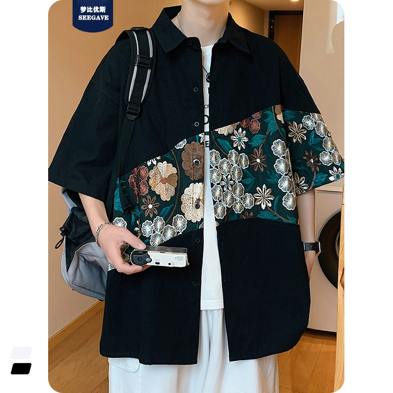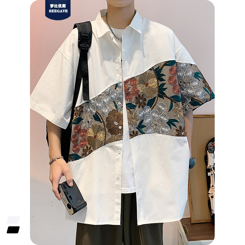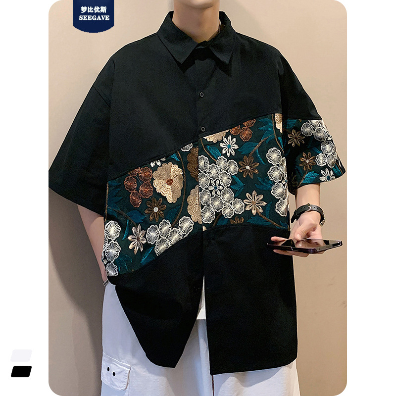 Phong cách trung quốc nam cao cấp cảm giác lưu manh đẹp trai áo sơ mi hoa mùa hè nam quốc triều thương hiệu thêu áo sơ mi ngắn tay áo khoác nam người mẫu
